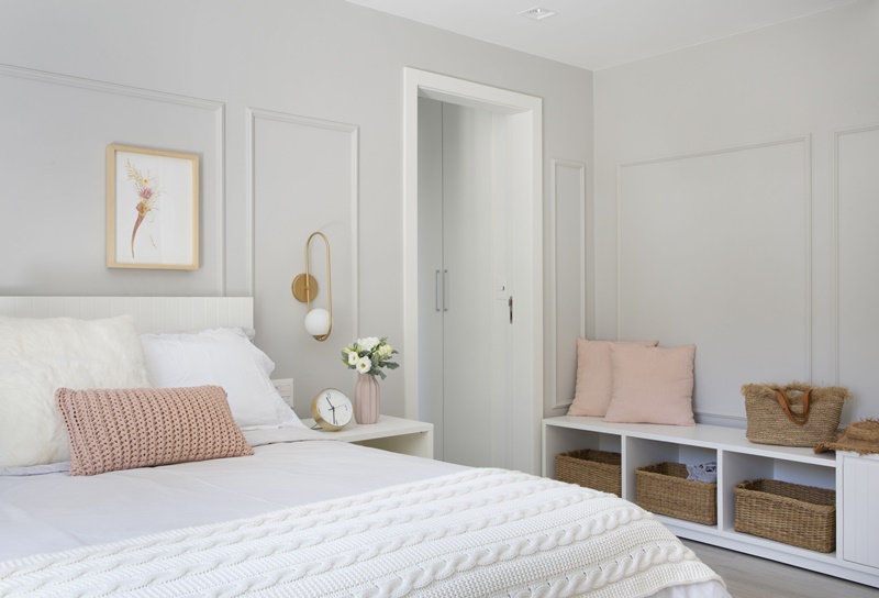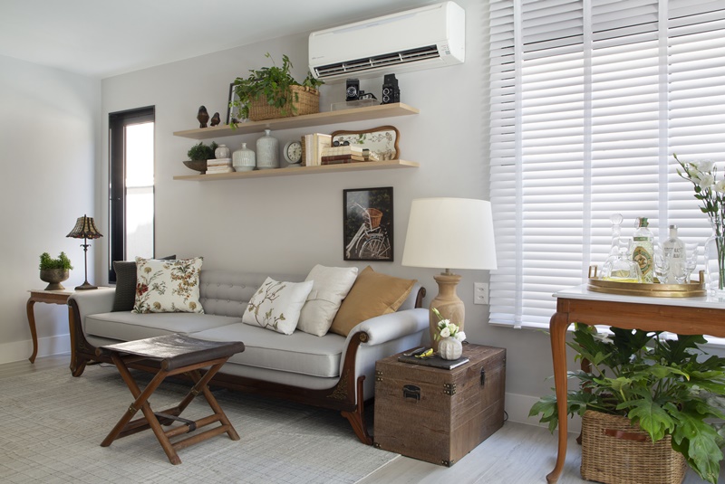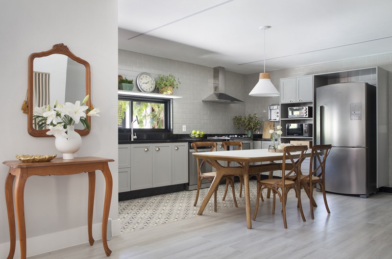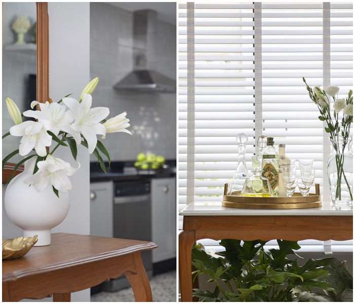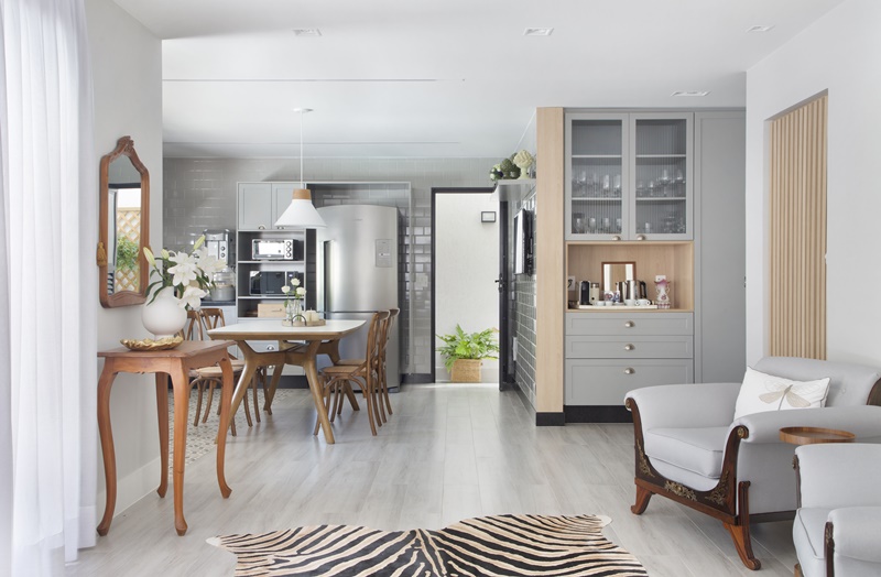 A paleta de cores da decoração da sala de estar integrada à cozinha tem o objetivo de trazer leveza ao espaço e permitir que a luz natural se espalhasse com mais intensidade, suavizando a presença de peças e itens decorativos de época, do acervo da moradora, que já são bem marcantes. “Buscamos uma neutralidade e atemporalidade na escolha dos acabamentos e cores, que também deixaram o espaço com um ar mais romântico“, acrescenta Livia Amendola.