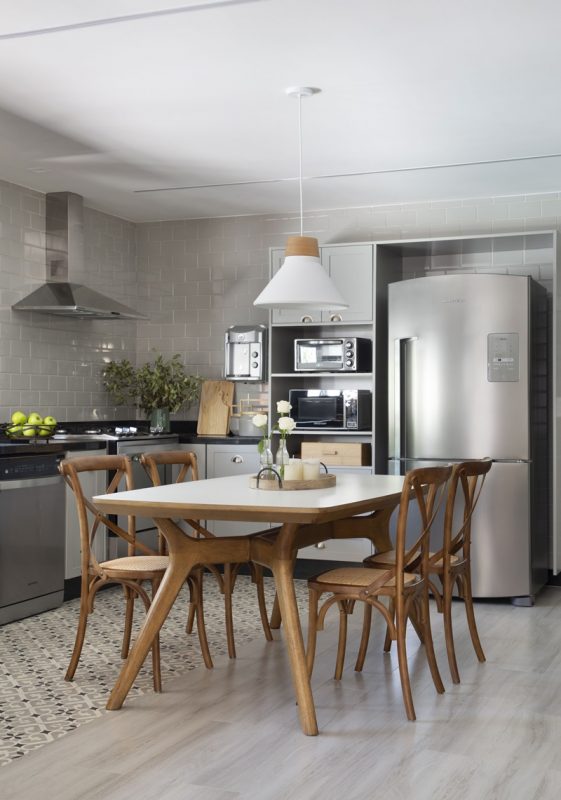 A cozinha integrada é valorizada por vãos que garantem a máxima integração com a área externa, permitindo ainda que a luz natural invada todo o espaço. Outro destaque é a divisão delicada do revestimento do piso da cozinha, um azulejo decorado que quebrou o padrão de piso linear e ainda trouxe uma pegada provençal e romântica. A presença de plantas também ajudou a reforçar a ideia da conexão entre espaços internos e externos.