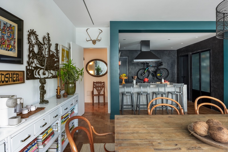 O apartamento é inteiro assim: uma grande miscelânea de móveis e peças garimpadas ao longo dos anos pela família: mesa de jantar, carrinho de bar, pufes, luminárias, caixas, cachepots… Tradicionais sinos balineses decoram o hall de entrada. Na cozinha, as latas antigas de mantimentos foram garimpadas em um mercado de pulgas no Brooklin (Nova York). E as mantas trazidas do Atacama hoje enfeitam o sofá em conjunto com as almofadas forradas com tecidos da Indonésia.