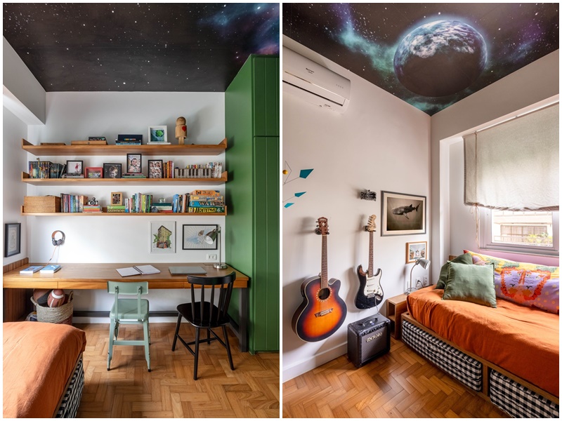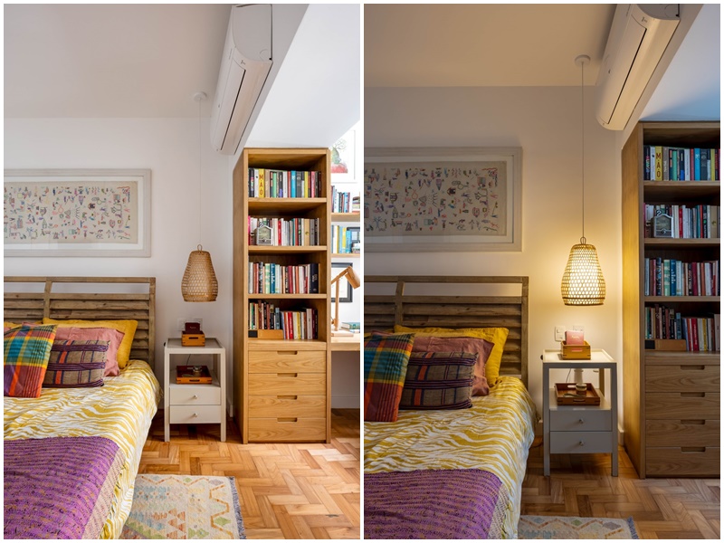 O quarto de casal – a parte mais difícil, segundo Camila – ganhou um home office com uma mistura de estampas coloridas e uma variedade de móveis e acessórios acumulados durante as viagens: as duas mesas de cabeceira e a cama vieram de Moçambique, as luminárias são de Bali e o quadro em cima da cama é um caminho de mesa comprado de um artesão na Namíbia.