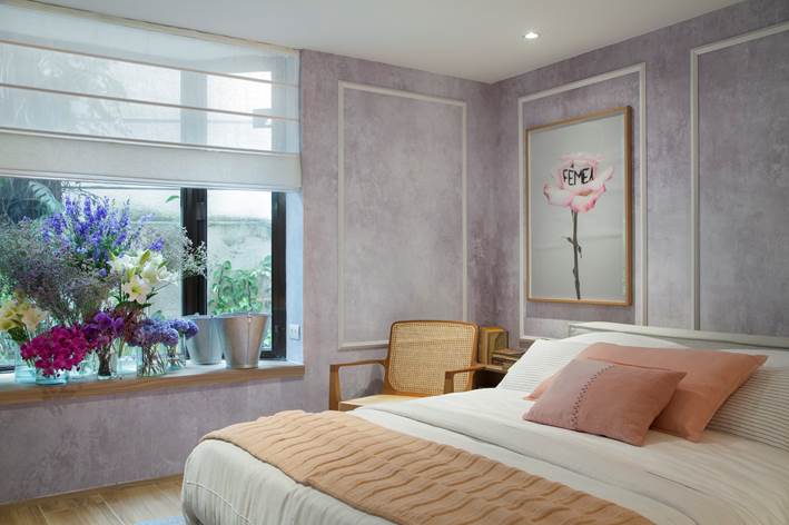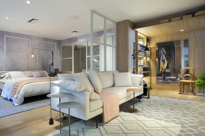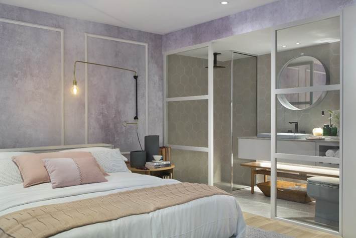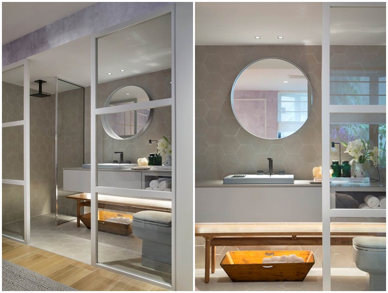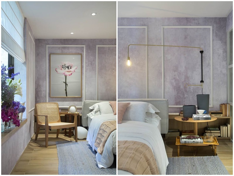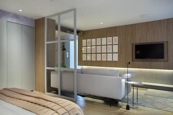 A paleta de cores, que mescla o rosa queimado, cinza, areia, branco e lilás, conferem suavidade e um toque de feminilidade ao espaço. Integrado ao quarto, o banheiro é setorizado através das divisórias em MDF laqueado na cor cinza e vidro transparente, e pelo revestimento cerâmico hexagonal. Em frente à cama, um confortável sofá e painel da TV em madeira compõem uma aconchegante área de estar, conectada ao hall de entrada do quarto –que conta com uma estante embutida, desenhada pela arquiteta, e um quadro de grandes dimensões, com fotografia de Denilson Machado.