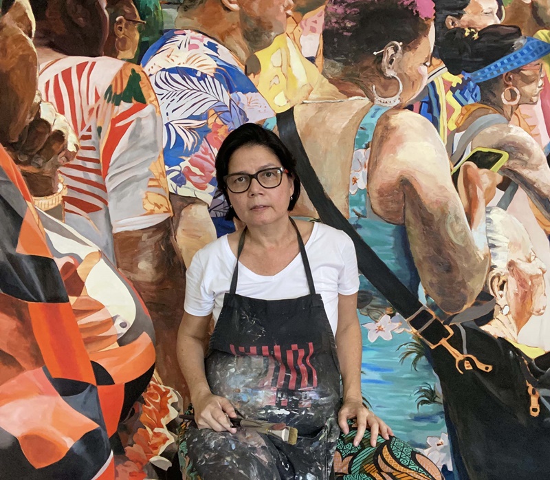 Com as fotografias em mãos, chega a etapa de ir para o ateliê e iniciar a pintura. Nesta série, a artista optou por ser totalmente fiel às estampas que vê, pintando-as exatamente da forma como encontrou nas ruas, mas acrescentando elementos aos trabalhos, criando novos cenários, não seguindo fielmente a fotografia. “Não quero que a pintura seja só uma reprodução fotográfica, por isso misturo os corpos, os lugares. Para que a pintura funcione, preciso escolher a relação entre figura e fundo”, conta.