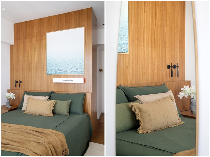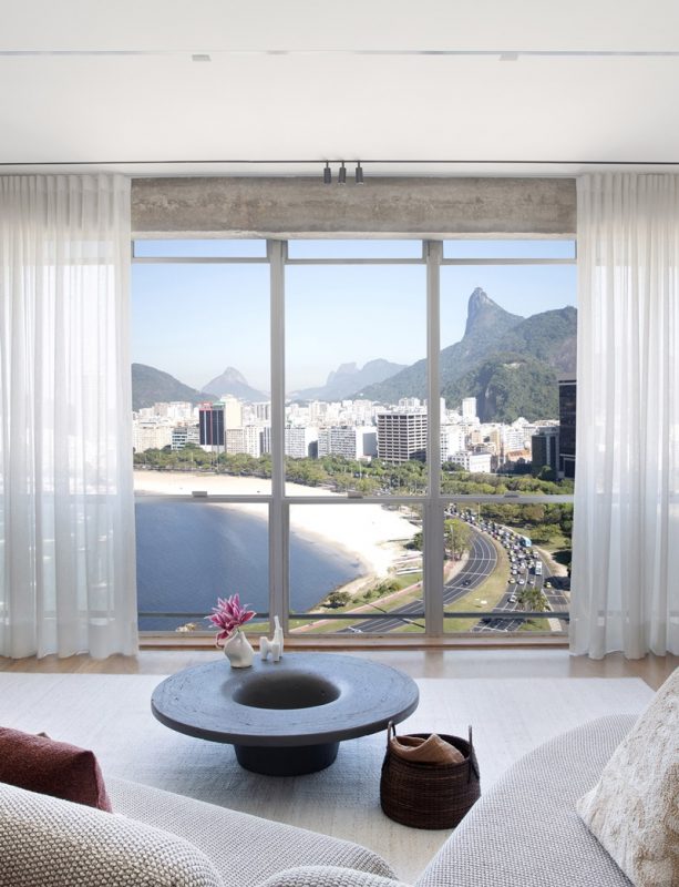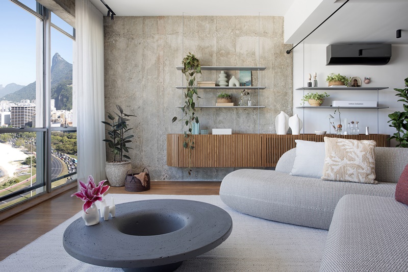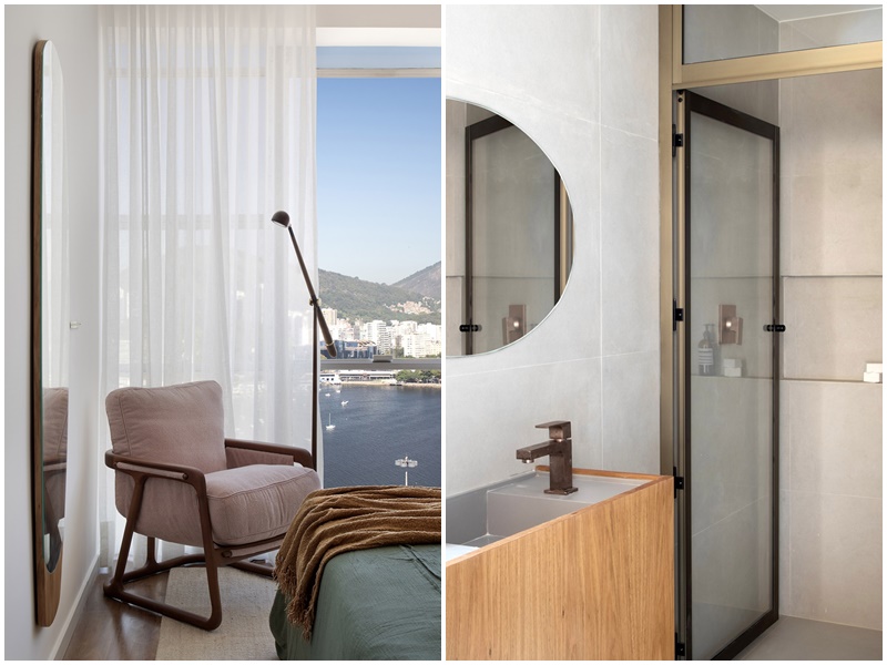 No geral, a decoração é neutra (para não tirar o protagonismo da vista) e segue o estilo contemporâneo atemporal, com predominância de peças com formas curvas, arredondadas e orgânicas, a exemplo do sofá, a mesa de centro, o aparador suspenso na sala e a mesa de jantar acoplada à “península” de cocção da cozinha. Bastante presente em todo o projeto – dos revestimentos das paredes aos móveis e armários, passando pelo piso em tábua corrida -, a madeira natural traz a sensação de conforto e acolhimento e ganha ares mais urbanos quando combinada com elementos em tons de cinza, como as duas paredes da sala em concreto bruto aparente, o tecido do sofá e o piso em porcelanato que delimita a área da nova cozinha. Adornos delicados, quadros e fotografias de paisagens cariocas que refletem o gosto e a personalidade da moradora foram garimpados na Casa Ocre. “O amor da ‘gringa carioca’ pelo Rio também está presente no revestimento cerâmico da parede do box do banheiro, com estampa inspirada no icônico calçadão de Ipanema”, exemplifica o arquiteto. “As cores aparecem de forma pontual nos dois banquinhos próximos à janela da sala, em alguns objetos e pequenos quadros e nas roupas de cama de linho natural”, ressalta ele. Para arrematar, vasos de grandes com plantas foram distribuídos em pontos estratégicos da sala.