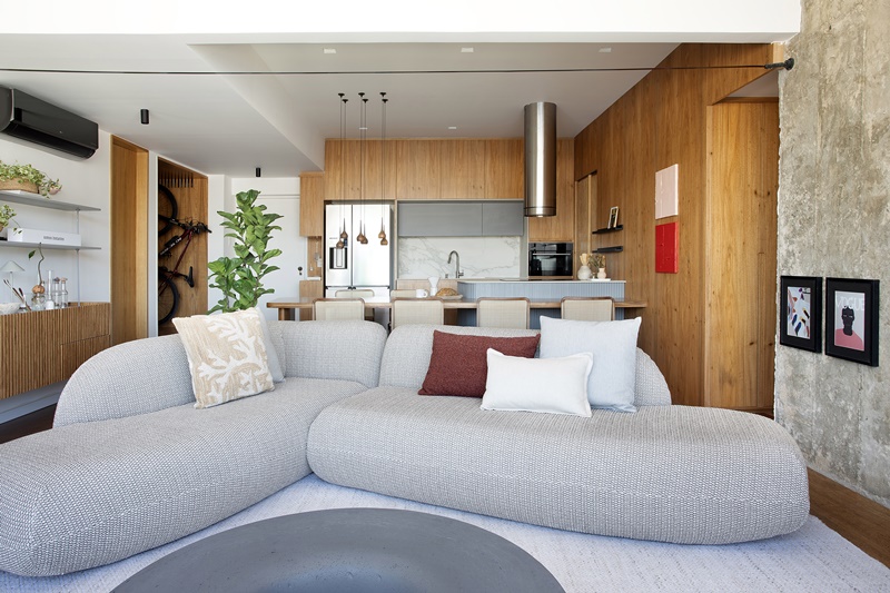A seleção de móveis priorizou peças assinadas por designers brasileiros, com destaque para o banco Leif, do Sergio Rodrigues, as cadeiras de jantar Oscar, do Beto Salvi e Tuti Giorgi, e o sofá Boomerang, do Bruno Jahara para a Lider Interiores.