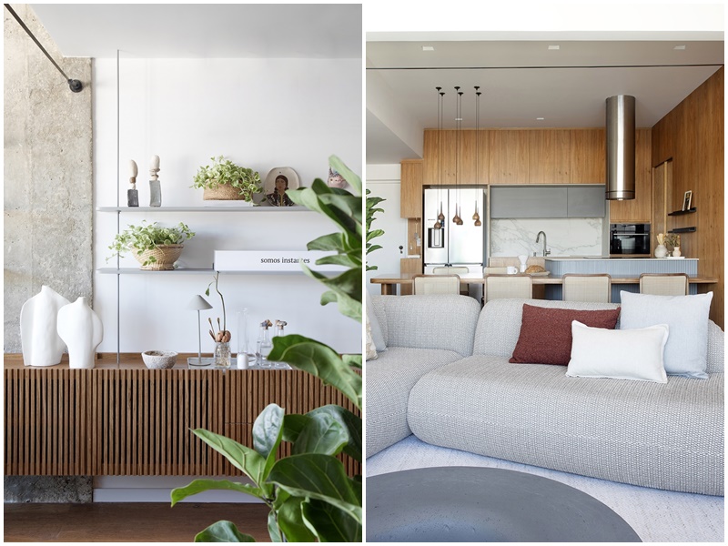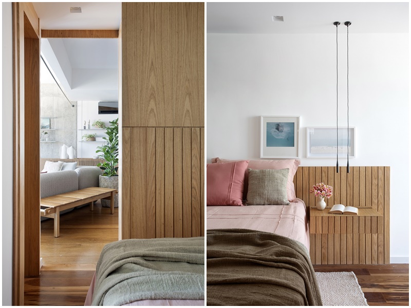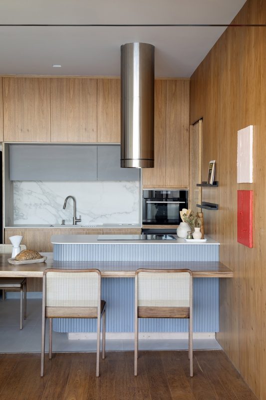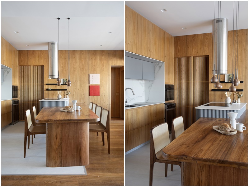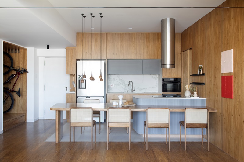 No projeto, o arquiteto destaca as marcenarias sob medida desenhadas por ele próprio, como os painéis de freijó natural que revestem as paredes da cozinha e dos quartos, a mesa de jantar (com tampo e base de quinas arredondadas) acoplada à península de cocção da cozinha e a estante da sala, composta de prateleiras aéreas e um extenso armário inferior suspenso, fixado na parede, com a frente ripada e as quinas arredondadas.