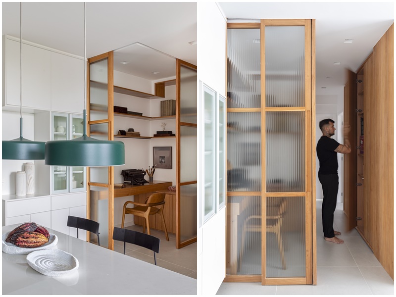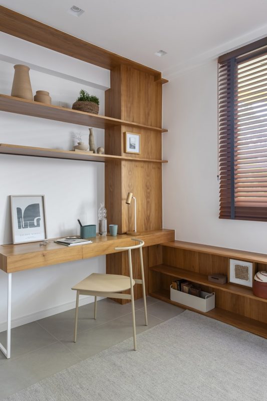 Já na cozinha aberta para a sala, o destaque fica por conta da mesa de jantar retangular (também desenhada pelo arquiteto), com interior em ipê natural e exterior em quartzo branco. Por fim, no hall íntimo, foi criado o “cantinho” do escritório, delimitado, de um lado, pelo pilar estrutural e, do outro, por portas de correr piso-teto.