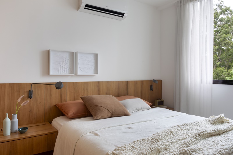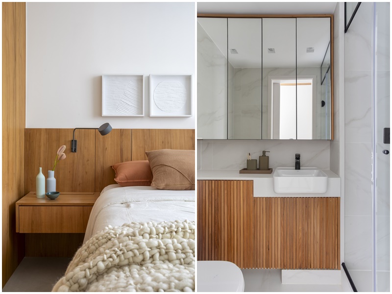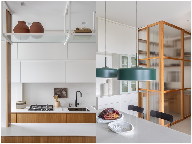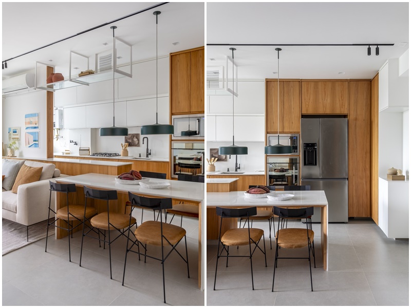 A neutralidade e atemporalidade também estão presentes no piso de porcelanato cinza, nas paredes pintadas de branco, nas marcenarias ora em ipê natural ora em laca branca, nas bancadas de quartzo branco e nas portas de correr com esquadrias amadeiradas e vidro canelado.