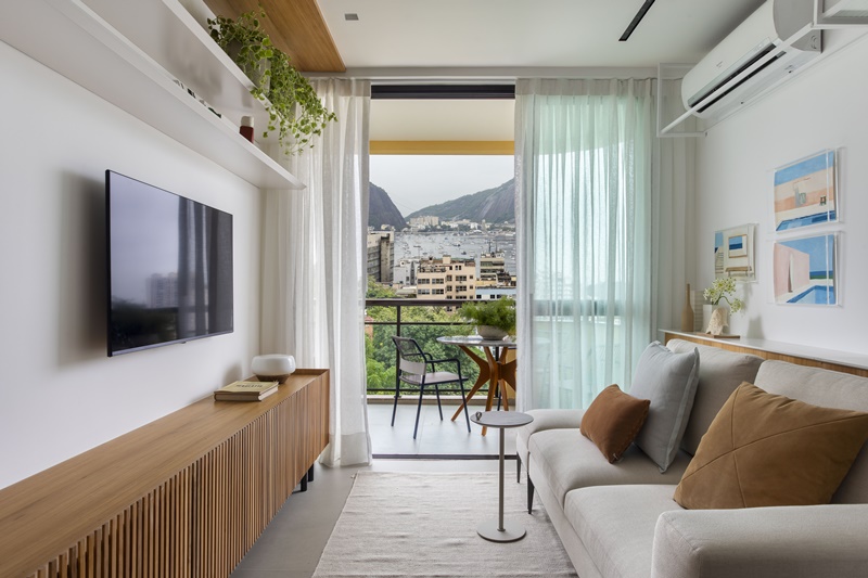 No geral, o conceito do projeto buscou criar um apartamento contemporâneo, funcional, neutro e claro, lançando mão de cores e materiais conectados com a paisagem externa para não tirar o protagonismo da vista do mar e do Morro Pão-de-Açúcar.