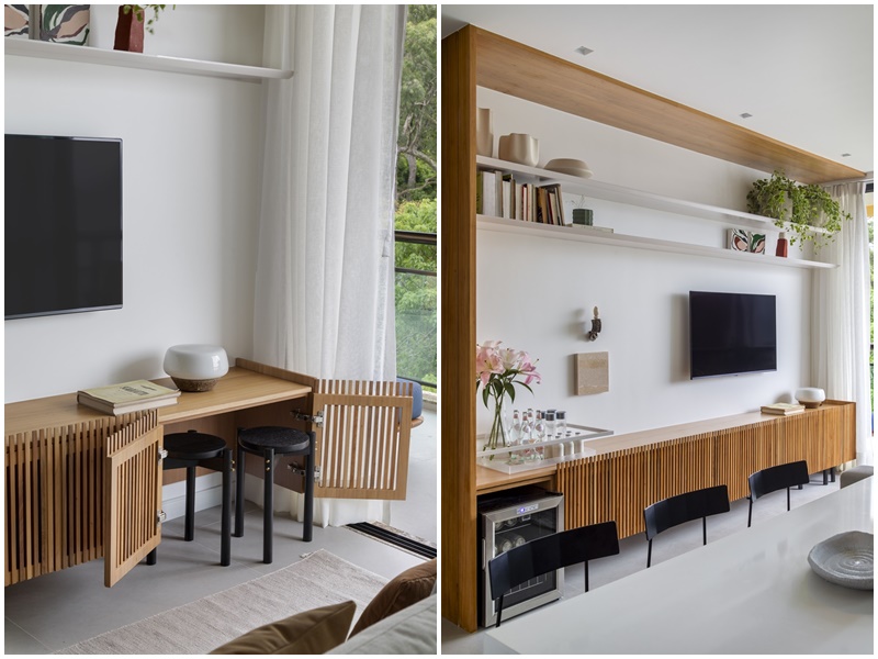 Na sala de estar com tv, a cereja do bolo é, sem dúvida, o móvel suspenso de marcenaria desenhado pelo arquiteto (com portas ripadas vazadas para esconder os equipamentos de áudio e vídeo) e as prateleiras brancas “flutuantes” (com borda chanfrada), enquadrados pelo “chapéu” amadeirado, preso ao teto. “Além da funcionalidade, esta solução acrescenta charme, personalidade e sofisticação ao ambiente”, avalia Rafael.