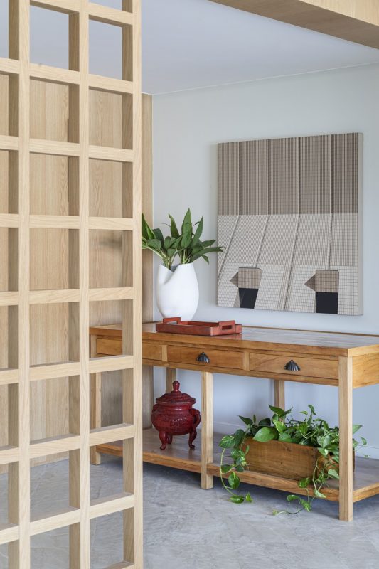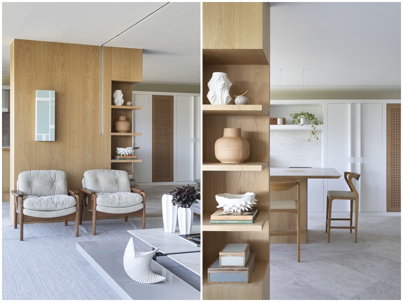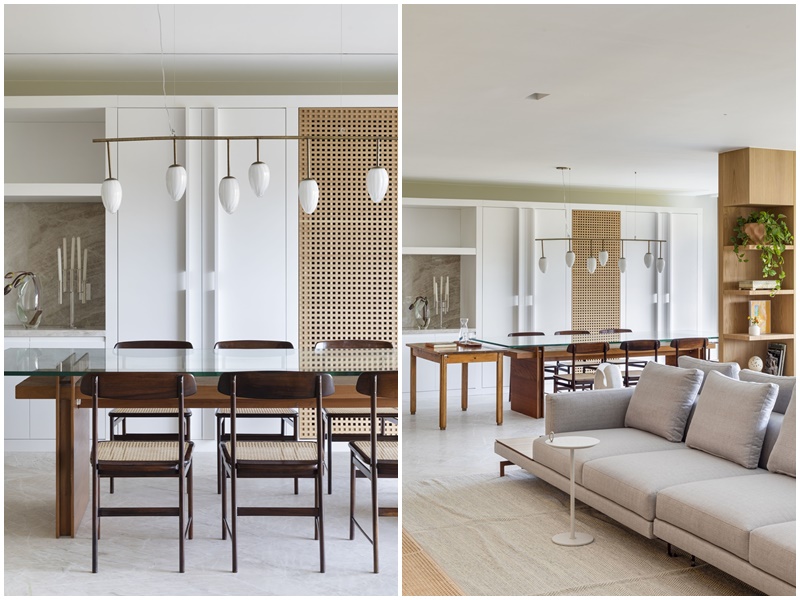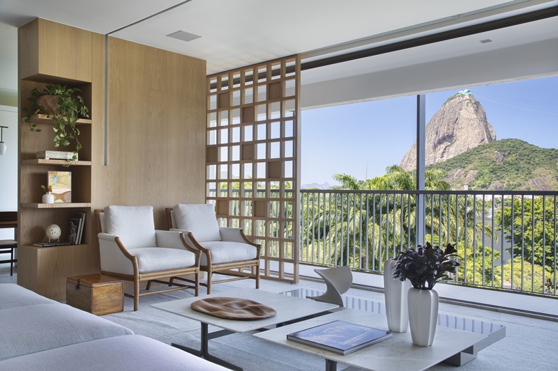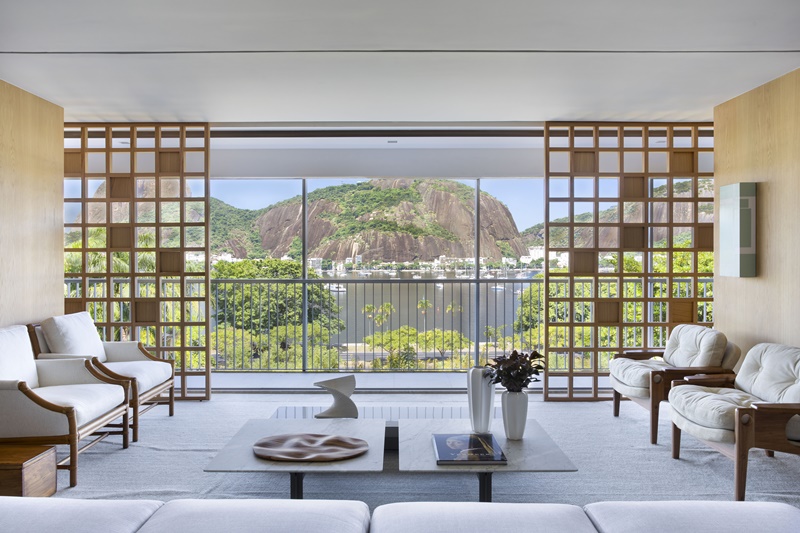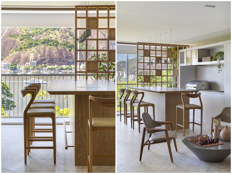 No setor social há uma presença forte do design modernista brasileiro, valorizado através de importantes composições, com destaque para o par de cadeiras Curva assinadas por Joaquim Tenreiro (da década de 60) e o conjunto de cadeiras Lucio assinadas por Sérgio Rodrigues, em 1956. Dimensões, alturas, volumes… todas as proporções do mobiliário foram pensadas para não haver interferência no visual estonteante da Urca. A marcenaria autoral desenhada pela própria designer inclui, por exemplo, as estantes gêmeas que ocupam as paredes laterais do living – cada uma com funções bem definidas. Já a estante do jantar acomoda louças, nicho para adega e um aparador horizontal com tampo e fundo de Dekton, que funciona como apoio da mesa de jantar e ainda conta com gavetas para acessórios de vinho. “Para acompanhar a amplitude do vão da extensa varanda, propus painéis deslizantes com placas aplicadas em carvalho americano, cujo efeito cria um ritmo com luz e sombra e funciona como um pano de fundo para a sala de estar. Os grandes painéis correm em trilhos discretos encaixados no piso e no forro de gesso, permitindo brincar com as formas dos desenhos e, de certa forma, proteger os ambientes quando se deseja aconchego e privacidade“, explica Devisate. A ideia de emoldurar a paisagem e criar um elemento de luz e sombra delicado para a fachada surgiu em conversa com os clientes, que são apaixonados por muxarabis – repare que o mesmo desenho quadriculado se repete no biombo presente na lateral do hall social. A pedido deles, todo o piso em mármore existente no setor social foi preservado e restaurado, e o tom areia do material aparece também nas bancadas (em Dekton by Cosentino, fornecidos pela Guandu Marmoraria) da cozinha e das salas de estar e jantar.