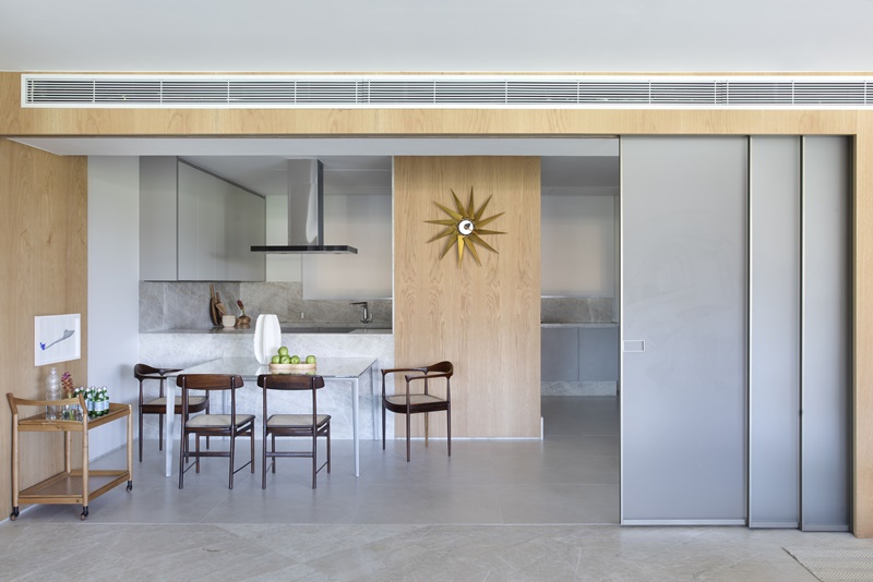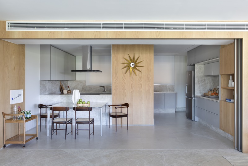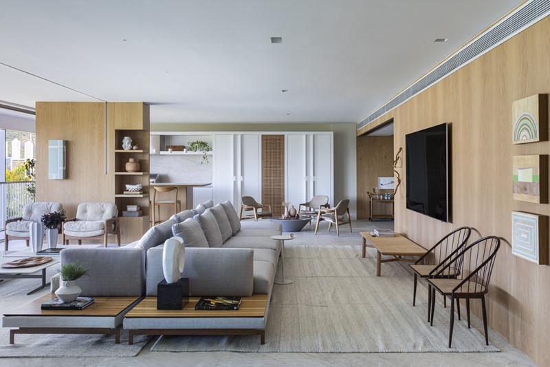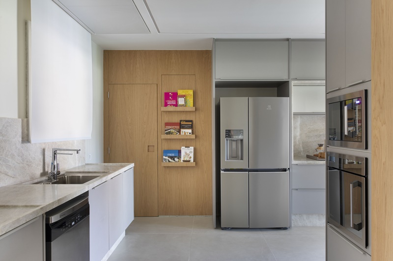 Outro pedido dos clientes foi integrar a cozinha com a área social do imóvel. “Como eles queriam ter a opção de isolar a cozinha quando houvesse necessidade, escolhemos as portas deslizantes Prada, da Cinex, que podem ser integralmente recolhidas por trás do painel da tv da sala de estar, deixando o vão totalmente livre“, informa a designer. A sensação de amplitude ganhou reforço extra no encontro discreto dos pisos, em tons próximos – em porcelanato cinza com grande formato na cozinha e mármore em tom areia na sala (original do apartamento e restaurado na reforma).