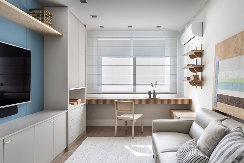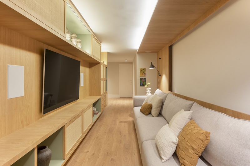 - Sala íntima: A sala íntima ocupa uma parte da circulação que faz a ligação do setor social com o setor íntimo. Reservada e protegida por uma porta deslizante, essa área estratégica da casa se transformou em um espaço organizado e silencioso, próprio para a família se reunir – ou a filha convidar amigos para aquela animada sessão de cinema com pipoca e muita diversão. A estante em Carvalho ocupa uma boa extensão da parede principal. Para deixar a marcenaria mais leve, Roberta Devisate escolheu traços retos, linhas simples e espaços sob medida para acomodar o home theater e muitos livros. As portas receberam palhinha natural, permitindo ventilação além de trazer um toque de charme e delicadeza à marcenaria. Destaque para a pintura em laca verde em partes estratégicas para valorizar a volumetria do móvel.