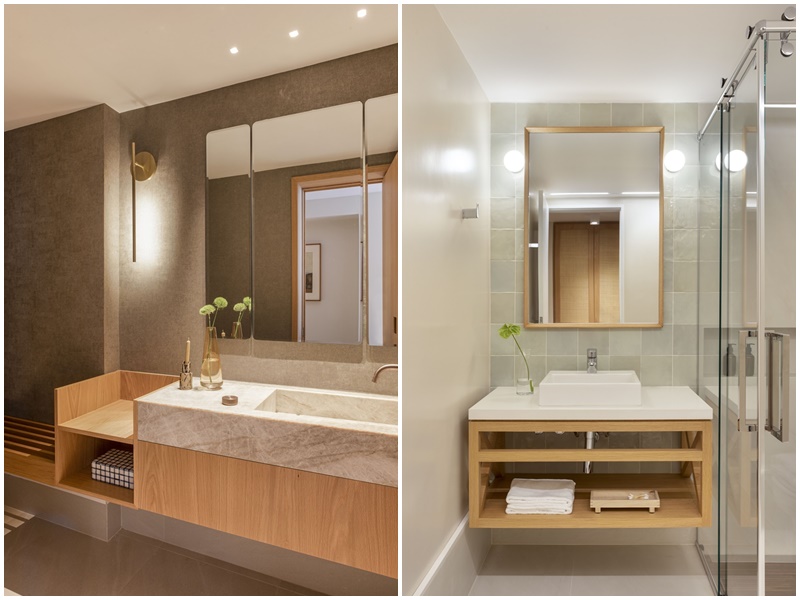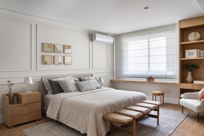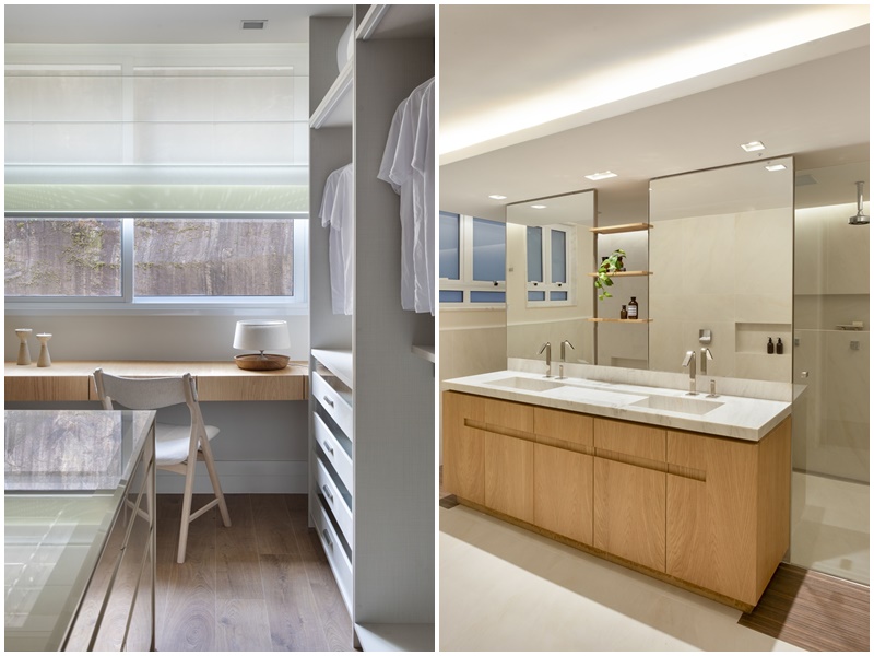 - Suíte máster: Dois quartos foram incorporados para ampliar o quarto de casal e atender ao pedido da cliente: um “walk-in closet”, com muita organização e planejamento. Dentro dele, a longa bancada em carvalho junto à janela funciona como apoio para maquiagem e auxilia na organização de acessórios, enquanto a ilha com gavetas e vidros acomoda miudezas, deixando tudo à mão. Com a alvenaria eliminada, foi possível forrar o fundo do armário, formando um amplo painel de carvalho em L, que esconde uma coluna estrutural. No dormitório, bem ao lado da janela, a torre com nichos e o apoio em madeira trazem aconchego e organizam livros, caixas e objetos.