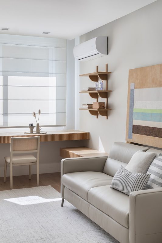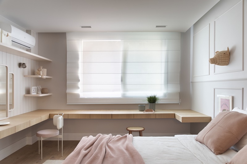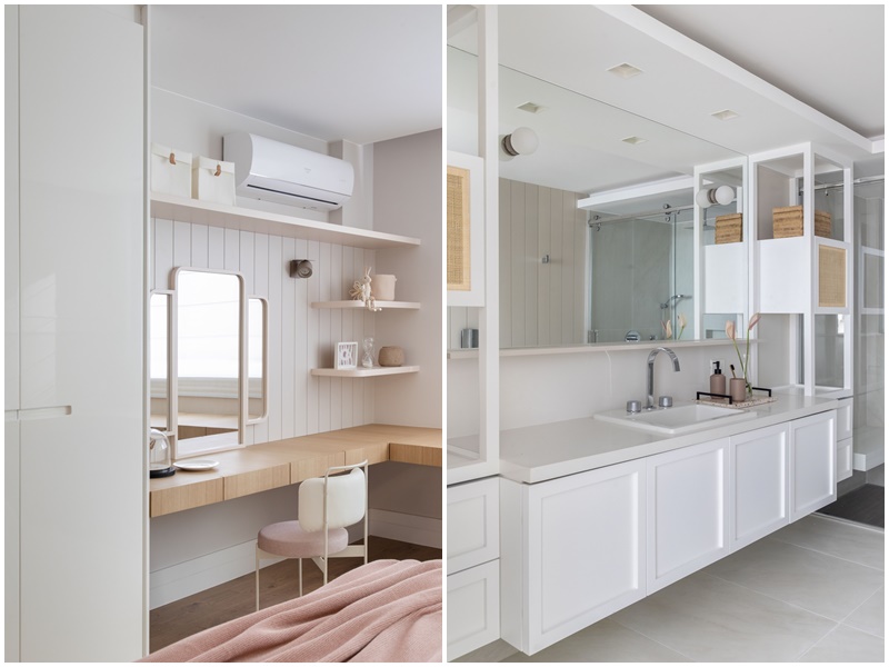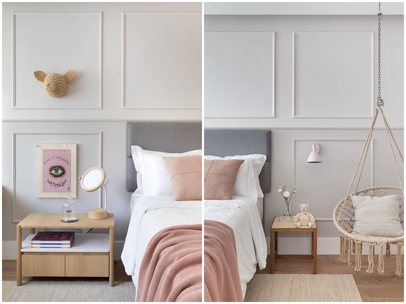 - Suíte da filha: Boiseries, dois tons de beges na pintura das paredes, um degradé de rosados na roupa de cama e marcenaria além da bossa do balanço em fibra. Tudo que a adolescente desejava para seu quarto foi prontamente atendido para criar um ambiente feminino e atemporal – nas palavras dela. A cabeceira estofada em linho grafite revela a maturidade estética da menina, que todo o tempo recusou papéis estampados ou cores cansativas. Mesmo firme com a ideia de um quarto perene que a acompanhasse por muito tempo, aceitou (e amou!) os detalhes propostos na marcenaria – que mescla painel em lambri e espelho com abas móveis para um espaço discreto de camarim. A ampla bancada em carvalho americano se estende sob a janela, aproveitando a boa luminosidade natural, além de organizar os artigos de papelaria, livros e miudezas. Já o banheiro da filha apresenta o mesmo painel em lambri em laca nude que fica refletido inteiramente no espelho da bancada, de quartzo branquíssimo. A palha sintética, em tom natural, foi escolhida para revestir as portas dos armários, acrescentando um toque rústico que quebra a formalidade do conjunto e ainda garante a ventilação interna no interior do móvel. Repare na simetria e delicadeza das torres laterais, com estruturas vazadas. Por fim, o piso e as paredes do box foram revestidos com porcelanato, da Portobello, e, para delimitar o piso da área úmida, a designer escolheu um acabamento com efeito de ripas, do Atelier Colormix.
