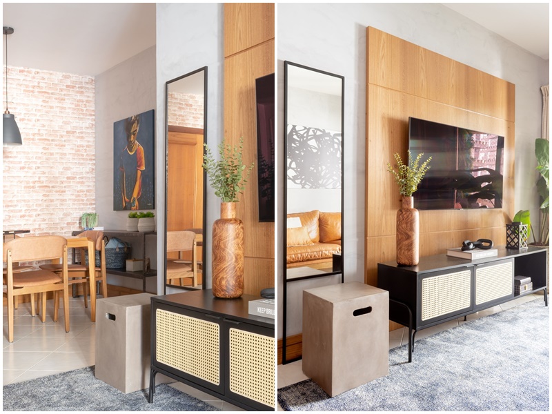 Como se tratava de um imóvel alugado, não houve modificações na planta do imóvel. A cozinha e os banheiros permaneceram como eram, a sala e os quadros ganharam novo visual sem quebra-quebra e o quarto de serviços foi transformado em um local para guardar equipamentos de esportes, malas, roupas de inverno e botas. No que se refere à decoração, todos os móveis são novos e alguns adornos vieram do acervo da cliente. Na sala de estar com tv se destacam o sofá em couro caramelo envelhecido com pés de metal e o rack ebanizado com portas de palhinha. Já no quarto da cliente, a cama com estrutura de ferro preto rouba a cena.
