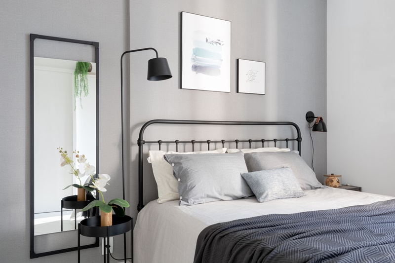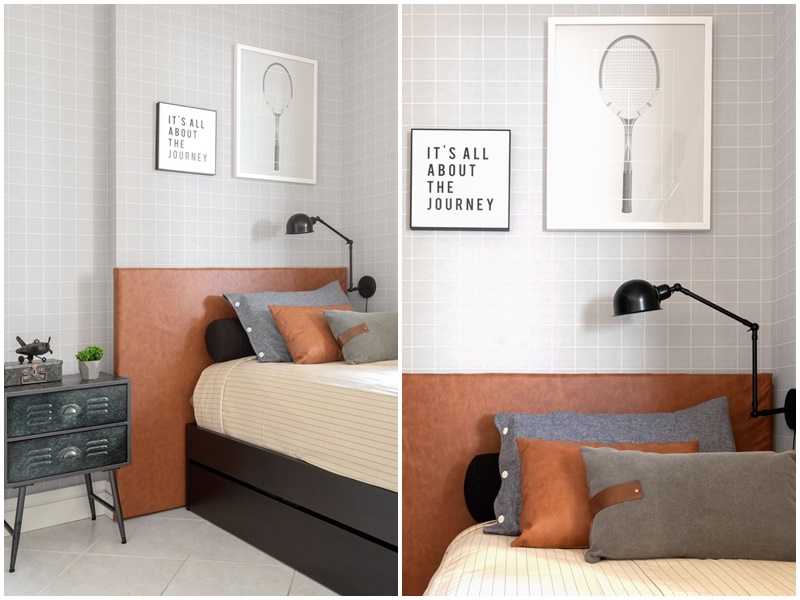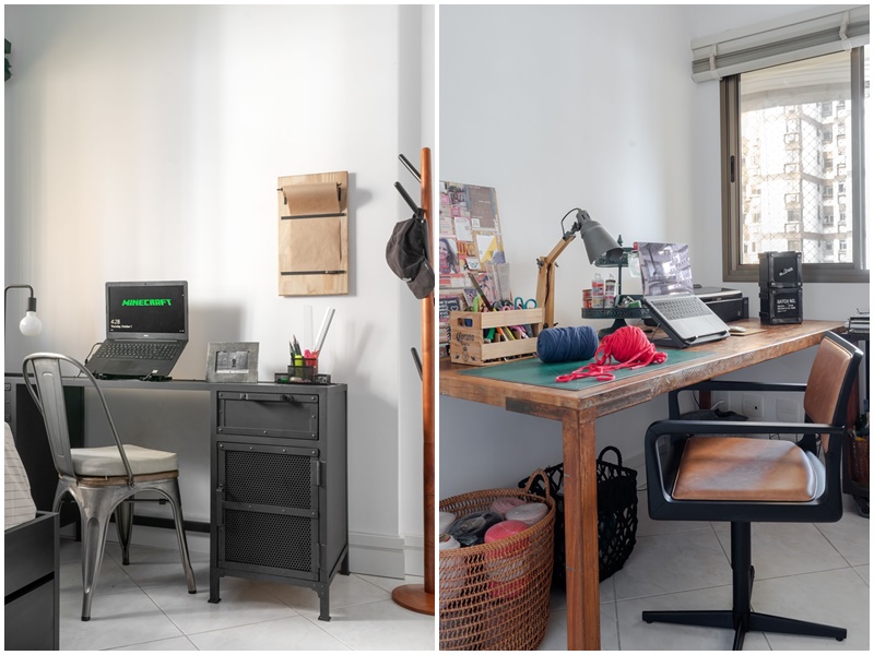 “Praticamente não houve obra. Trocamos os rodapés, refizemos a pintura e aplicamos papel de parede. Mesmo sendo o imóvel alugado, como a cliente queria investir em marcenaria, projetamos algo simples para que ela pudesse remontar em um eventual novo endereço e investimos em móveis de qualidade, com design atemporal“, conta Fernanda. “A cliente queria que todo o apartamento tivesse um ar industrial. Também gostamos do estilo, mas tínhamos pensado em algo mais acolhedor para ela e o filho“, acrescenta. A solução encontrada pelas arquitetas foi investir pesado em materiais que “aquecem” o ambiente – como couro, tijolinho de demolição e madeira natural, equilibrando assim a frieza que o cimento e o metal preto costumam evocar. Outro pedido da cliente foi transformar um dos quartos em ateliê, já que seu hobbie principal é fazer artesanato. “Criamos este espaço a partir de móveis em madeira de demolição, metalon, ferro e objetos antigos que faziam parte do acervo pessoal da moradora“, explica Fernanda. Segundo ela, outro desafio foi projetar o quarto do filho de nove anos, sem deixá-lo infantil. Neste caso, a solução foi combinar cabeceira em couro caramelo, papel de parede xadrez e móveis de ferro e madeira. “Ele adorou o resultado, pois conseguimos usar todas as referências que ele nos apresentou“, relata.