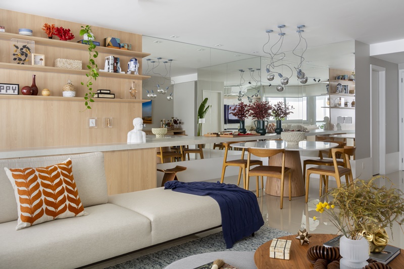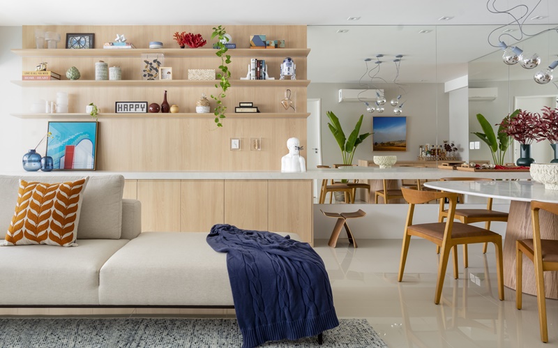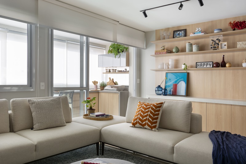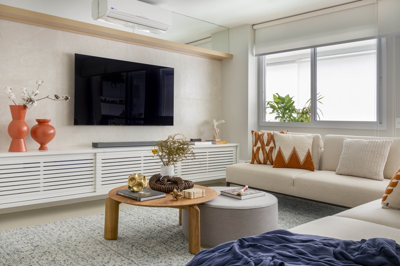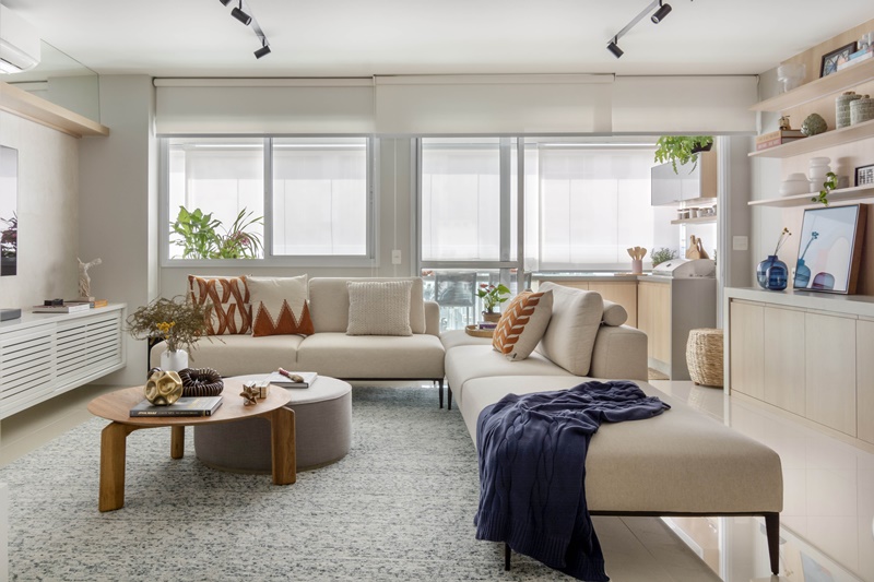 Quanto a paleta de cores, a arquiteta buscou trabalhar com tons claros, de bege e madeira carvalho, trazendo mais cores nos adornos, almofadas, mantas e tapete, como azul e terracota. “A ideia é conferir a sensação de um ambiente mais suave, mas ao mesmo tempo interessante e com vida”, conta Amanda.
