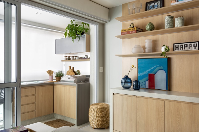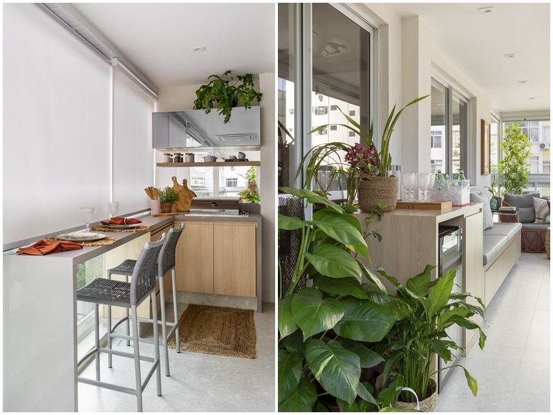 - Bancada na varanda para apoio de um novo grill e espaço para refeições. Uma premissa da arquiteta foi criar uma integração suave da varanda com a sala, conferindo amplitude à área estreita da varanda. Para isso, o sentido de abertura da porta foi trocado e o vão de passagem foi ampliado, além de adotar os acabamentos da marcenaria no mesmo tom usado na sala, conferindo a ideia de continuidade.