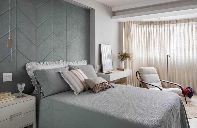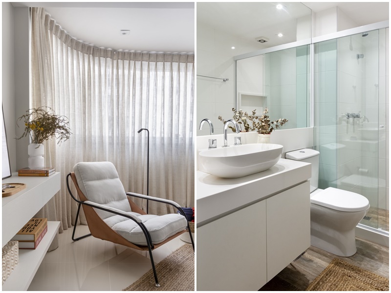 A inspiração é uma arquitetura mais clara, funcional e limpa. “Na sala, busquei utilizar poucos móveis, basicamente um sofá, mesa de jantar, uma grande estante com bancada de porcelanato e o rack da TV. Já na varanda, a proposta foi otimizar o espaço estreito e comprido, criando uma área de bancada para o grill, espaço para refeições, mesa, sofá com baú, uma confortável poltrona e espaço para as plantas, trazendo um pouco mais de vida para o apartamento”, descreve a arquiteta.O quarto ganhou novas cabeceira e marcenaria, com um closet mais generoso para o casal. Já no escritório, a preocupação foi atender à demanda de acolher a coleção dos clientes.