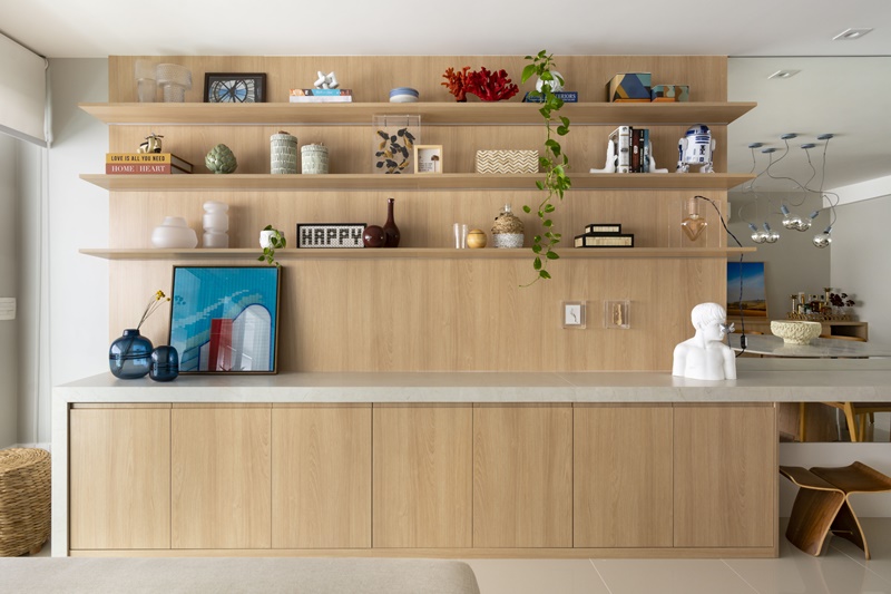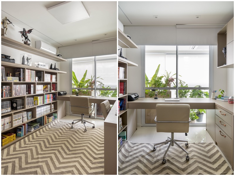 Já para o escritório, houve uma demanda específica: como ambos são colecionadores de mangás e action figures, precisavam de uma marcenaria sob medida para comportar toda a coleção, além de uma bancada com espaço para duas pessoas trabalharem de casa, se necessário. “Para isso, criamos uma bancada em L em frente à porta que dava acesso à varanda, adaptando seu uso apenas como janela e abrindo mais um espaço para a área de trabalho”, conta a arquiteta Amanda Miranda.
