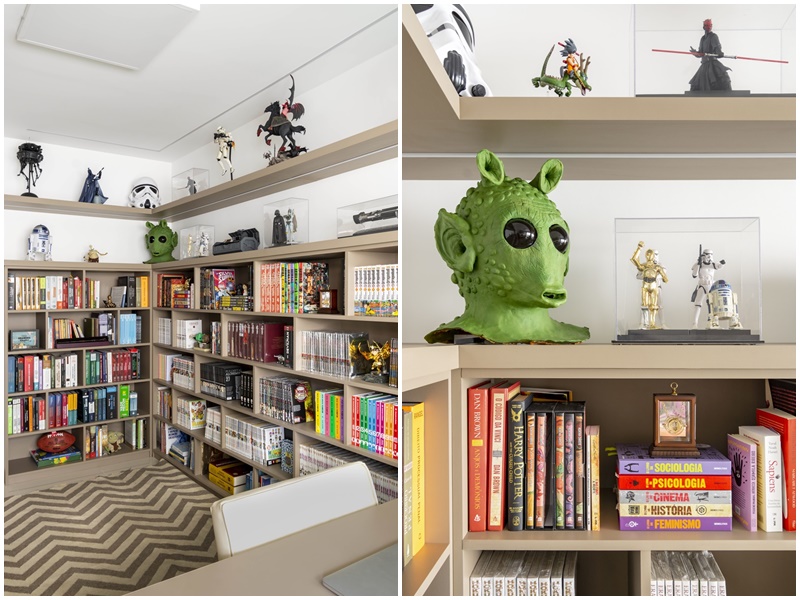 - Considerações sobre o escritório: A coleção de livros e action figures dos clientes influenciou bastante no projeto para o escritório, pois eles já possuíam uma coleção bem expressiva, em termos de número de peças, e pediram para considerar uma futura ampliação. Na parte mais alta da estante foi criado um espaço direcionado aos bonecos, com iluminação projetada para valorizar cada peça, e embaixo uma estante sob medida para comportar o máximo possível de livros, revistas, comic books e mangás. “Foi tudo muito bem pensado para valorizar cada peça e atender à demanda dos moradores. A marcenaria seguiu um tom de cinza para acompanhar parte da bancada existente, que foi reaproveitada. O resultado é imperceptível. O contraste de cor, do cinza com o colorido das peças, destacou cada item de especial valor para os moradores”, descreve a arquiteta.