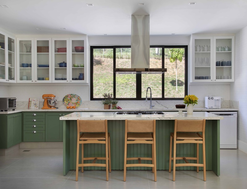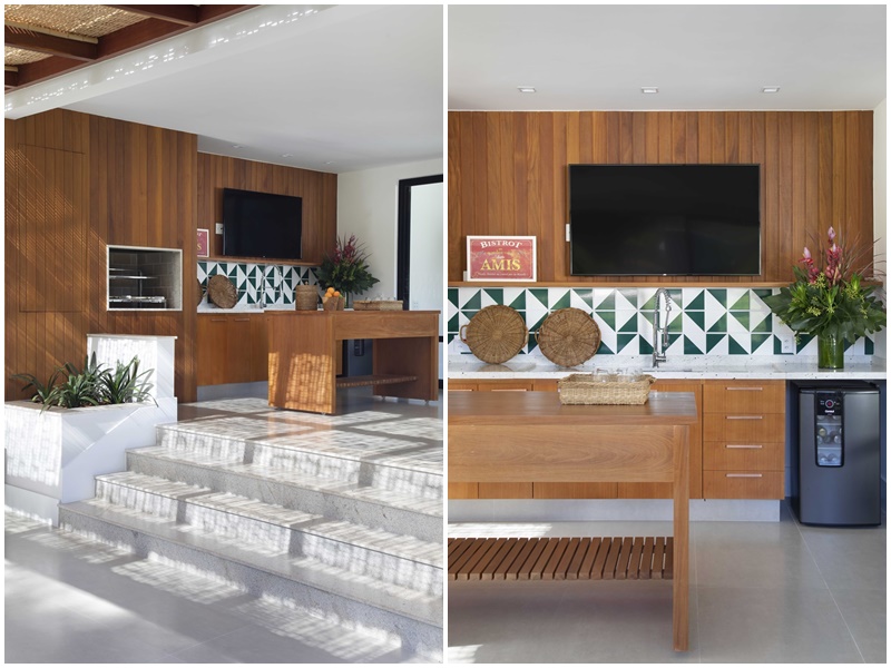 Essa proposta predomina especialmente na área social: “quando você entra na sala, você vê através dela, vê o jardim do outro lado. O pé direito alto, com madeiramento do telhado aparente, reforça a sensação de amplitude”, descreve Bitty. Para compor os interiores com toda essa interferência externa, a paleta de cores adotada é suave e natural, com elementos em madeira na sala e na varanda gourmet, e toques de verde na cozinha, que ganhou armários laqueados nessa cor. A casa inteira tem o mesmo piso, um porcelanato cinza-claro, em prol da praticidade e facilidade de manutenção.
