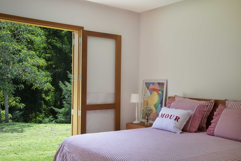 A cozinha foi pensada especialmente para a cliente, que ama cozinhar: ela é totalmente aberta para a sala de jantar e dispõe de uma ilha central, onde as pessoas podem se acomodar e interagir durante o preparo das refeições. Já os quartos contam com maior privacidade, mas continuam integrados ao jardim por portas que abrem para fora da casa. “Fizemos também uma passagem entre os blocos da área social e íntima como se fosse um corredor transparente, com vidro nas laterais e no teto, com cobertura de palhinha. Por ali, você também pode acessar o jardim da piscina”, explica Cecilia.