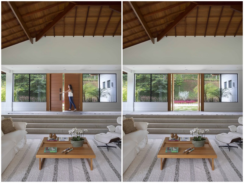 A casa é dividida em três blocos: no centro, fica o bloco da área social, que reúne sala, cozinha, área gourmet e varanda; à direita, é o bloco da área íntima, com quatro suítes e rouparia; à esquerda, fica o bloco com área de serviço, garagem e depósito, voltados para os fundos da casa, além de sauna e lavabo voltados para a piscina. A área externa ainda dispõe de uma lareira ao ar livre. “O conceito do projeto é que fosse uma casa transparente dentro do terreno, com ambientes integrados entre si e com o jardim. Para isso, fizemos os blocos separados e usamos grandes janelas e fechamentos em vidro para trazer o exterior para dentro da casa. Os clientes adoraram essa ideia”, conta Cecilia.