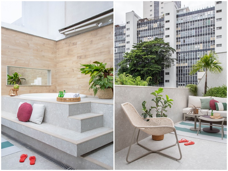 Entre as principais modificações na planta do imóvel, o acesso à sala íntima do segundo andar foi alterado para integrá-la à área gourmet, que foi ampliada. “Antes, havia uma pequena cobertura sobre a churrasqueira, com uma circulação descoberta à frente“, lembra Amanda. Na área externa descoberta, havia a intenção de aproveitar o spa existente, mas ele precisou ser deslocado para o melhor aproveitamento do espaço; já no local do antigo chuveiro, foi criado um ambiente de estar e o novo acesso ao spa. “Aqui, optei por plantas em vasos para facilitar a manutenção, que é feita pela própria cliente”, justifica ela.