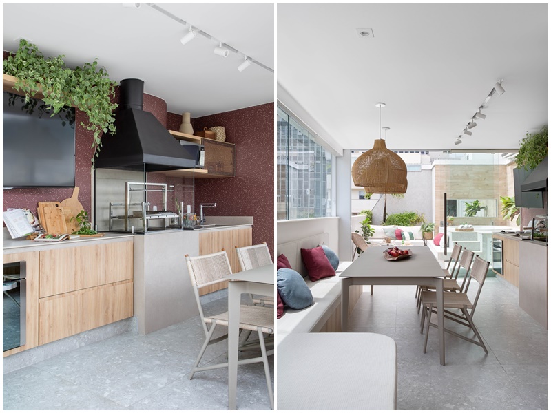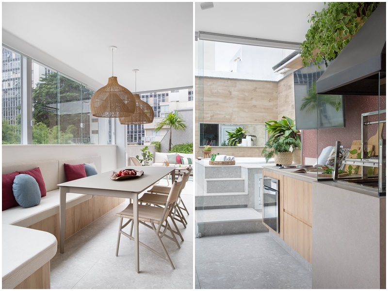 Na decoração, praticamente tudo é novo. No andar superior, apenas foram aproveitados o spa e a churrasqueira existentes. “Para otimizar a área gourmet, projetamos um grande banco de alvenaria, revestido com porcelanato que imita madeira, em toda a extensão dele, servindo de assento para a mesa de jantar e chaise longue em sua extremidade. Hoje, esse grande banco virou o lugar mais disputado da casa”, conta Amanda. Já no andar de baixo, foi aplicado piso vinílico amadeirado sobre o porcelanato existente para “aquecer” o espaço e mudar completamente a atmosfera dele, sem precisar gastar muito nem fazer obra pesada. Como a cliente tinha uma mesa quadrada com quatro cadeiras que atravancavam a entrada, no novo projeto, a arquiteta criou um banco em marcenaria e desenhou uma mesa com formato orgânico, não só para melhorar a circulação da sala como também para acomodar até seis pessoas.