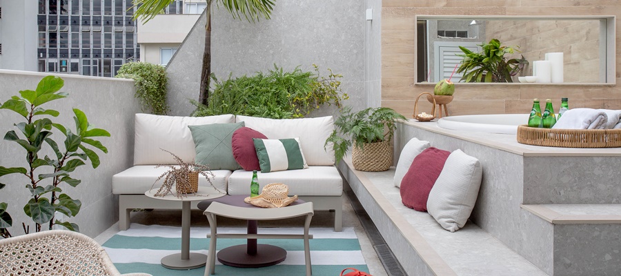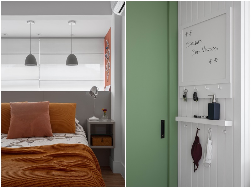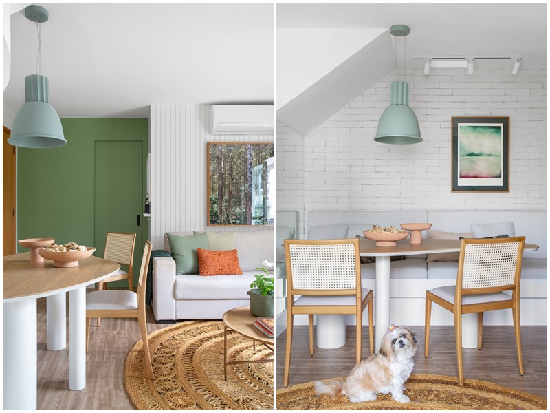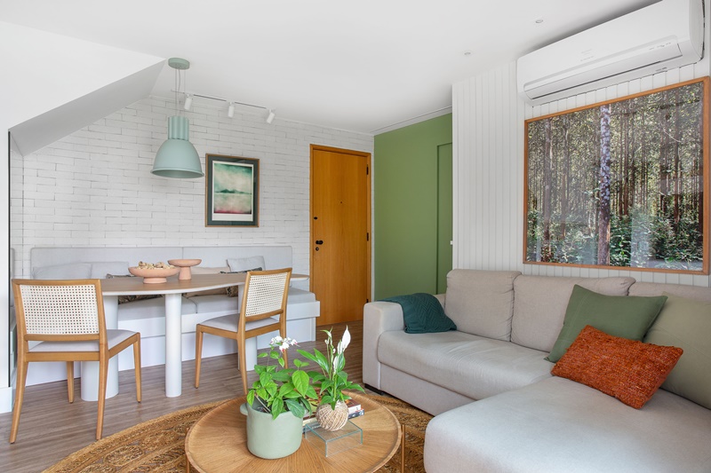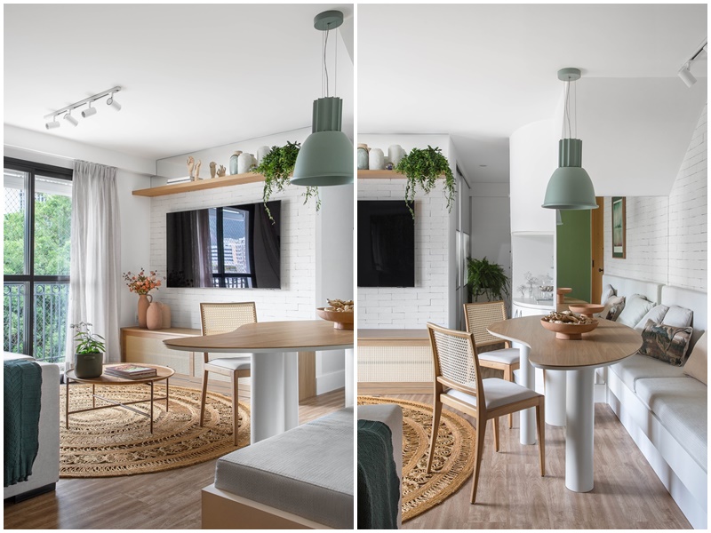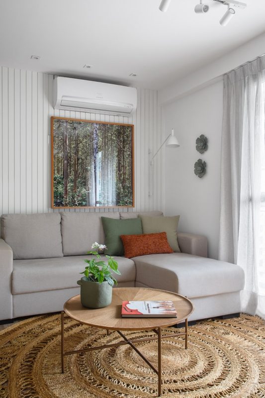 A arquiteta conta ainda que se inspirou na arquitetura escandinava, com um toque de Boho-chic, para definir o conceito do projeto, mesclando cores claras e tons terrosos associados ao verde com materiais que remetem à natureza, como a palha natural presente em luminárias, portas de armários e tapetes, o porcelanato que imita textura de rocha e as plantas naturais. Segundo ela, a farta presença de luz natural nos espaços também contribuiu para aumentar a sensação de conforto e aconchego.