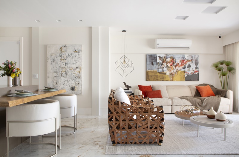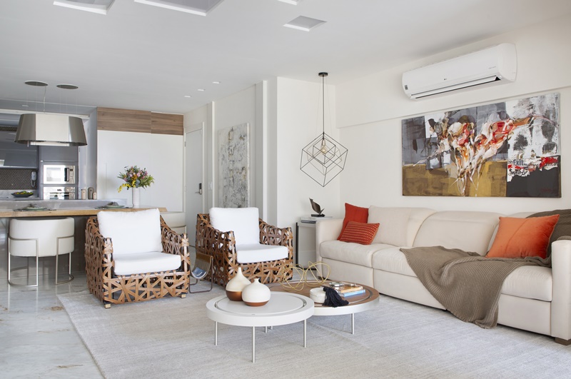 Já entre o living e varanda foi feita a substituição de todo o piso por um modelo único – marmorizado, com fundo claro e veios em tons terrosos – nivelando os espaços e conferindo a sensação de amplitude. A varanda gourmet reforça a vocação do casal de receber amigos e familiares, dispondo de churrasqueira, mesa para 6 pessoas e estar com TV. Em relação à paleta de cores, a arquiteta parte de tons neutros na marcenaria e paredes, com elegantes toques de cor – na sala, as almofadas em laranja seguem os tons da tela de Sebastião Rodrigues, acima do sofá, enquanto na varanda predominam elementos em preto e verde.
