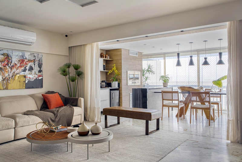 Na área social, foi feita a integração total da cozinha, living e varanda.