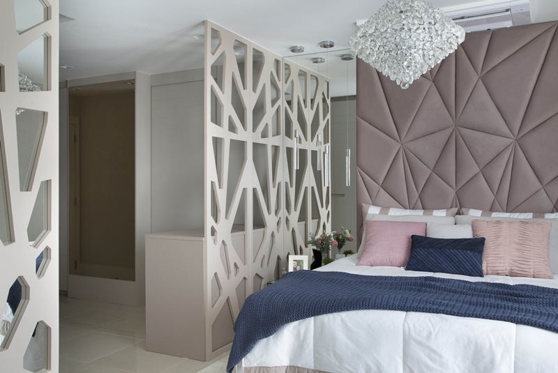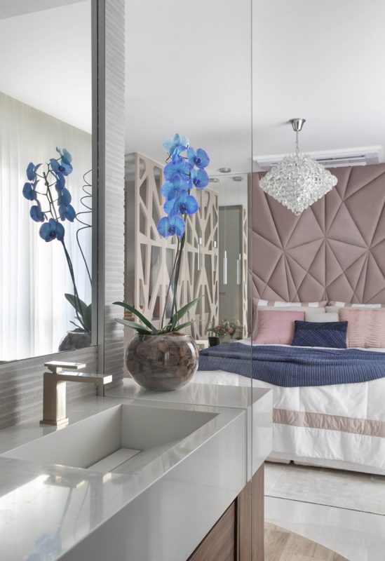 “A suíte máster é leve, romântica e cheia de jogos de luz, proporcionados pelos painéis vazados que separam o quarto do closet. Feitos com corte a laser, contam com fundo em espelho no trecho em frente à banheira, conferindo maior profundidade ao ambiente”, conta Virna. “Outro destaque da suíte é sua multifuncionalidade: o home office incorporado ao quarto foi solicitado antes mesmo da pandemia e é muito utilizado pelos moradores”, revela a arquiteta.