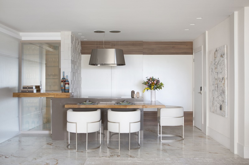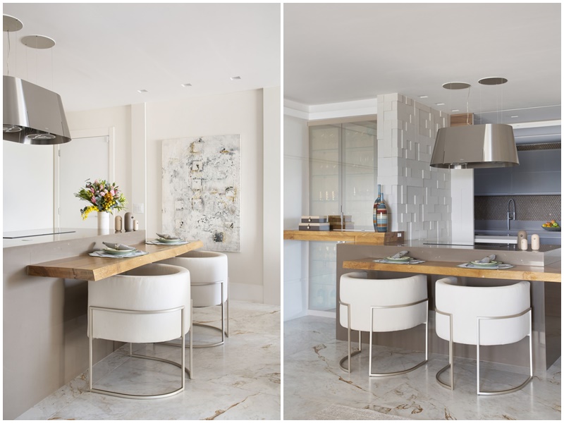 “Foi um pedido especial do proprietário, que curte cozinhar para os amigos. Ao redor da bancada, acoplamos uma mesa de madeira com borda orgânica”, descreve Virna.