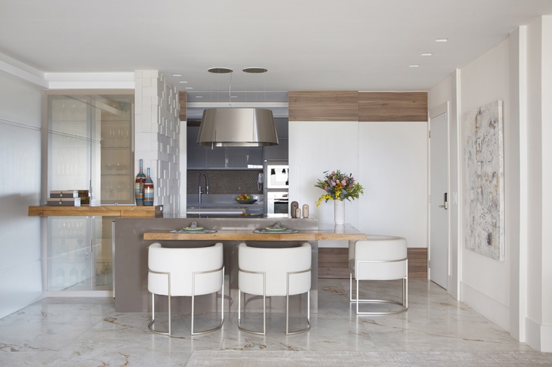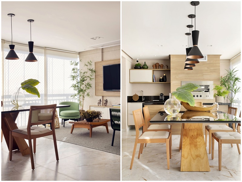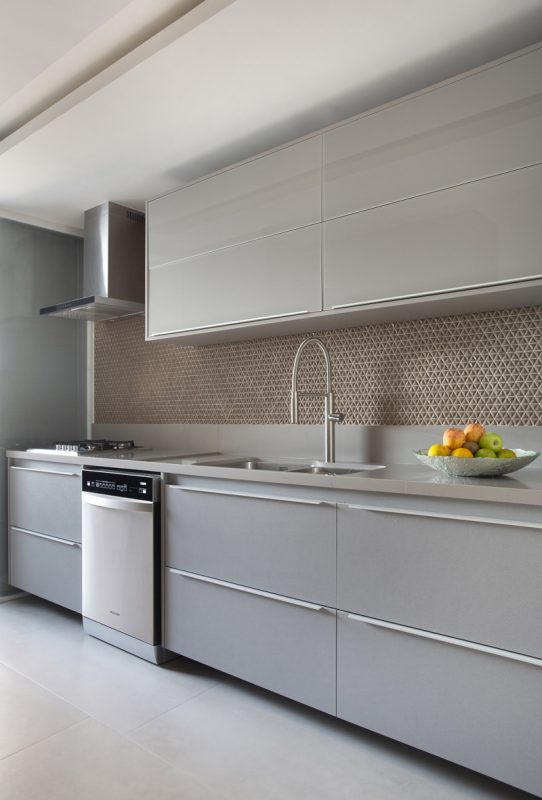 “Eliminei a parede entre a cozinha e o living, propondo como solução o uso das portas de correr para isolar os cômodos quando conveniente”, explica Virna Carvalho. “