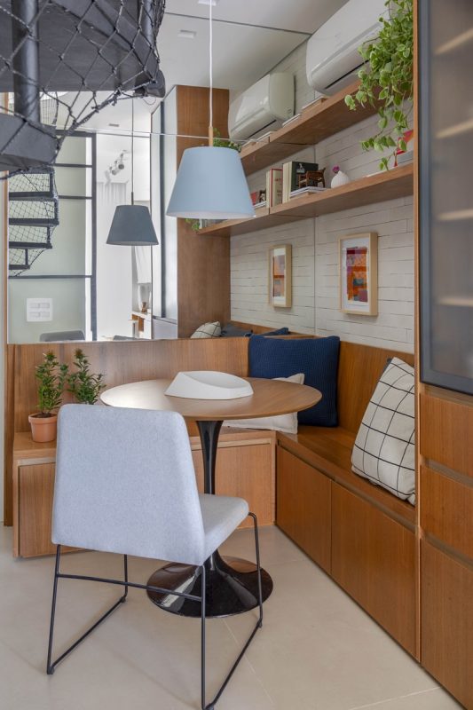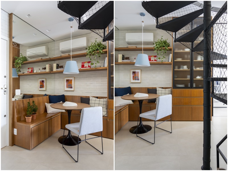 No projeto, Marina Romeiro destaca ainda a copa em canto alemão, com gavetões sob o assento, que permitiu um melhor aproveitamento do espaço e deixou a circulação mais fluida; a bancada suspensa de frente para a janela do quarto do casal, que agora permite que os clientes trabalhem enquanto apreciam a vista da Lagoa Rodrigo de Freitas; o revestimento de tijolinho na parede da sala de refeições do primeiro andar e na sala da TV do segundo piso, que deu uma ideia de unidade e continuidade dos espaços.