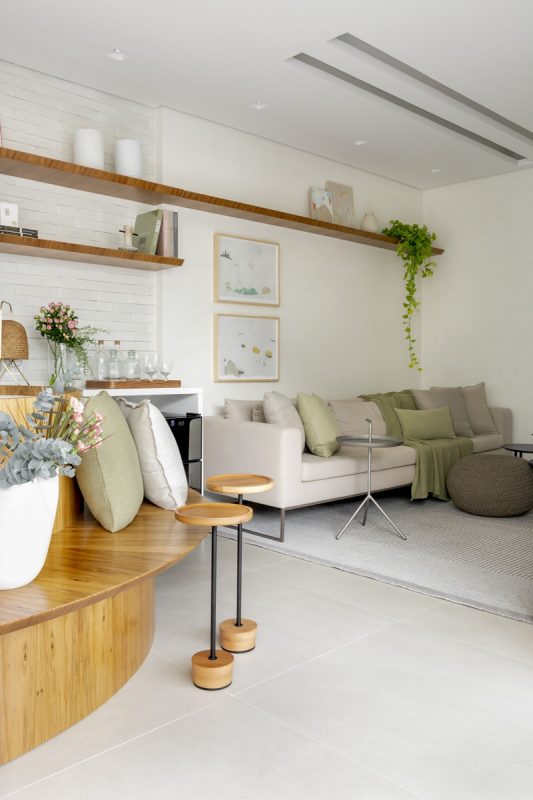 Na área social foi usado piso de porcelanato com uma textura de pedra, madeira (freijó), preto (nos perfis metálicos, escada e objetos pontuais) e leves pitadas de cor, salpicadas por todos os ambientes. A escada, existente, foi pintada de preto para dar um ar mais moderno. Na sala de TV, o banco em marcenaria segue o desenho da escada helicoidal e quebra a ortogonalidade da marcenaria e do mobiliário. “Ele exerce uma função estética e funcional, pois também pode ser usado como assento tanto para quem está interagindo com a sala de TV quanto com a varanda”, explica a arquiteta.