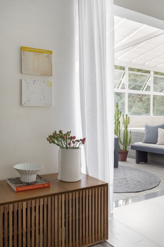 No primeiro andar, a reforma contemplou a área de refeição/copa e o quarto do casal (que virou uma suíte máster) e, no segundo andar, a sala de estar com tv, que foi totalmente repaginada e ganhou novo layout. Ficaram para a segunda etapa do projeto a cozinha e a área de serviço no piso inferior e a varanda e a suíte de hóspedes, que ficam no andar de cima. “Como os clientes já tinham uma sala de tv no segundo andar, incorporamos a sala de estar e o lavabo do andar inferior ao quarto do casal para criar uma super suíte, abrindo espaço para um banheiro bem maior, além de closet e escritório integrados à área de dormir”, conta a arquiteta. “Sem dúvida, esta suíte com ares de loft é a cereja do bolo do projeto”, acrescenta.