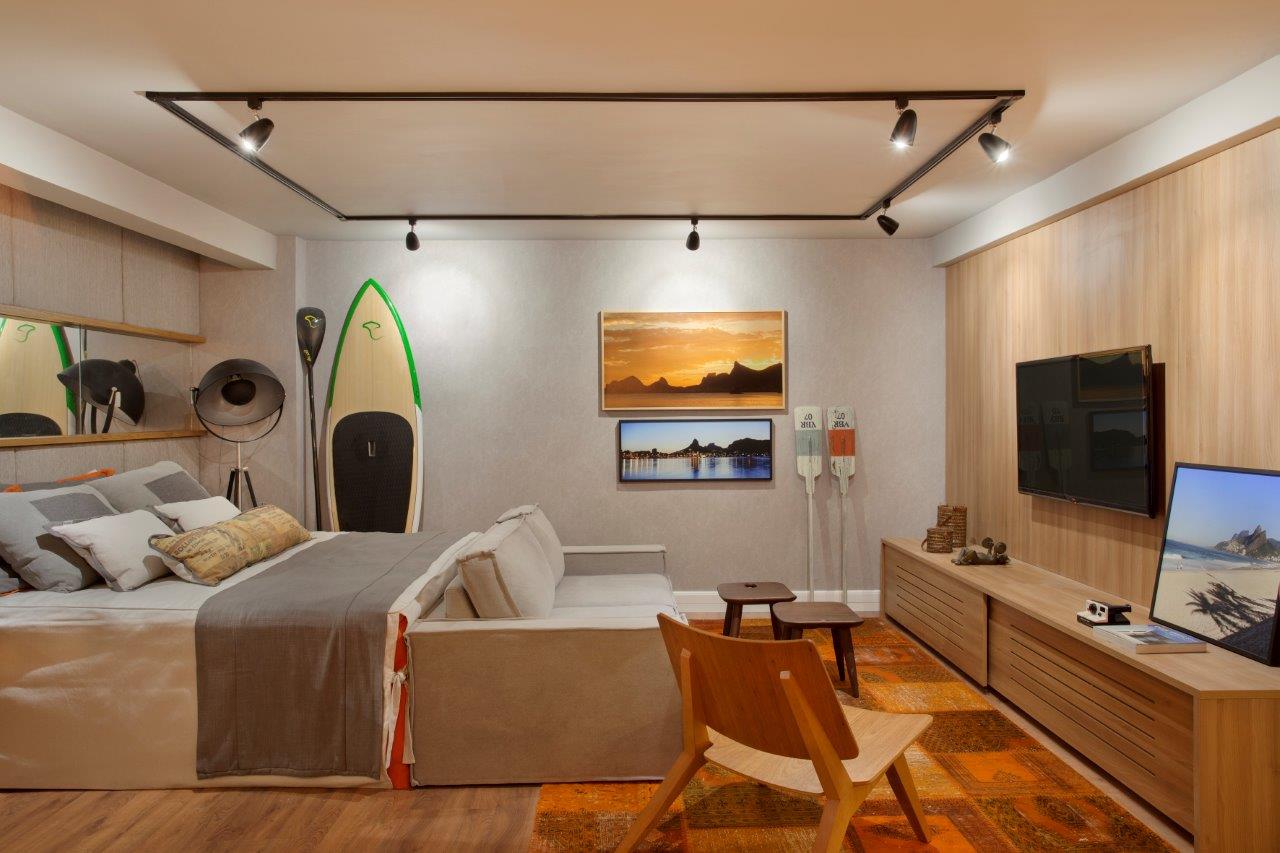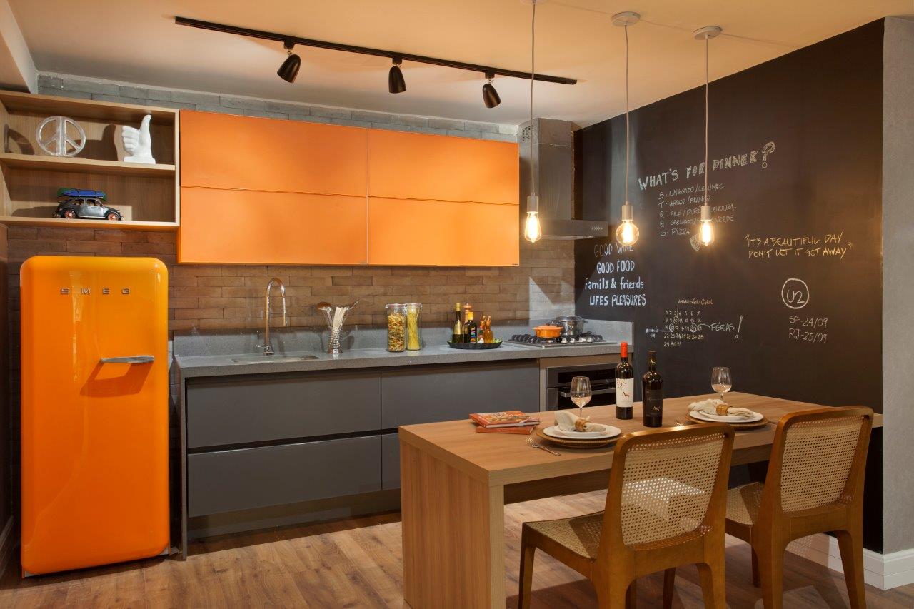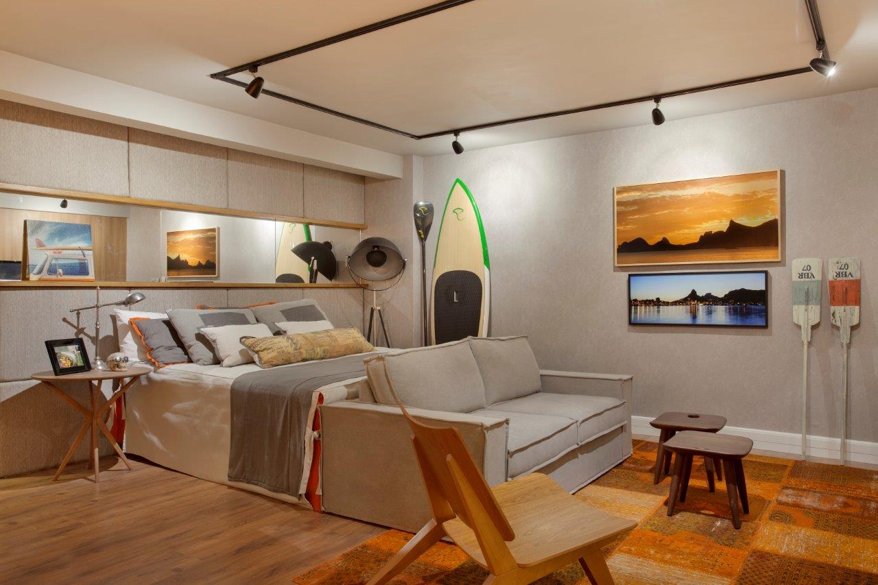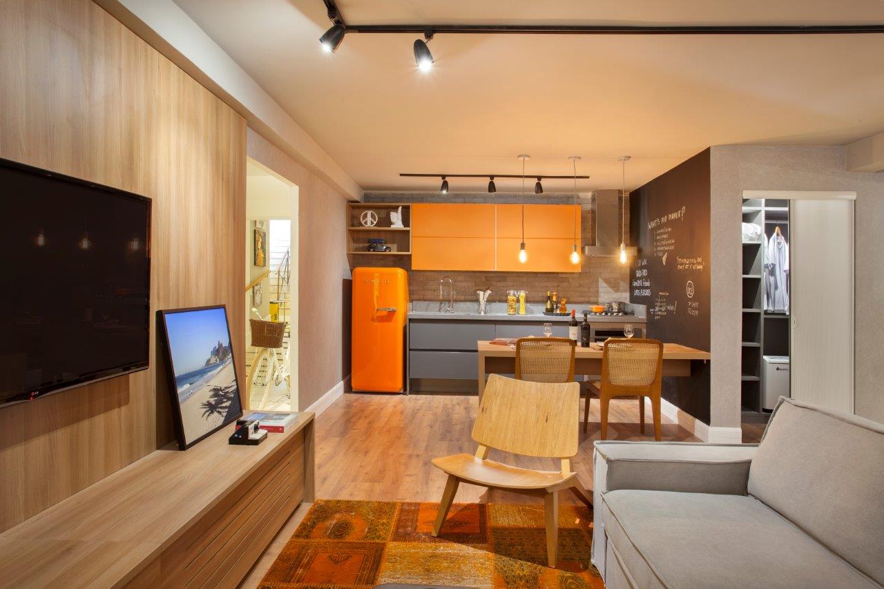 O Estúdio do Solteiro, projetado pela arquiteta Andressa Fonseca para o Morar Mais 2014, teve como inspiração o estilo industrial, utilizando muito cinza com um toque vibrante de laranja. A designer optou por abrir mão do rebaixo de gesso, assumindo a laje e distribuindo a iluminação em trilhos. Contemporâneo e despojado, o espaço de 35m² foi idealizado para um solteiro antenado. O espaço destaca-se por sua pegada urbana, mobiliário assinado e ambientes integrados.