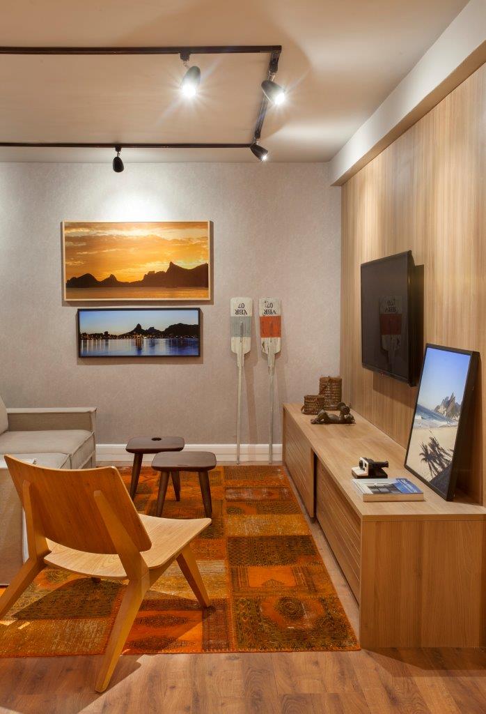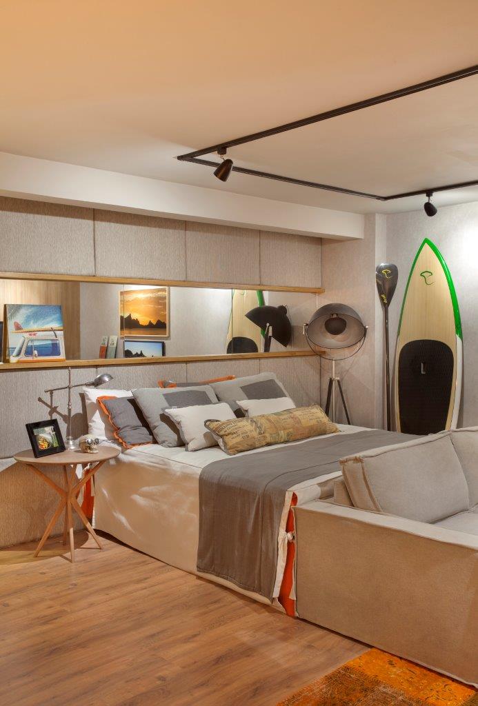 Principais fornecedores: – Almofadas, cabeceira, papel de parede e piso laminado da By Floor – Itens decorativos da Rosa Kochen – Armários da Roma Mobili – Casa Julio Tapetes (tapete laranja)