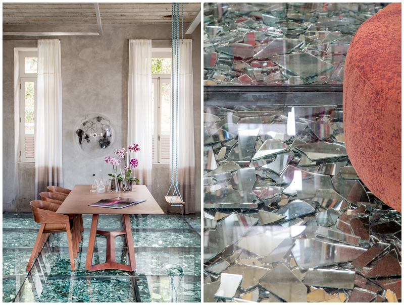 O grande destaque fica para o piso de cacos de espelho, recoberto por vidro, da TTr Vidros em parceria com a Guardian. Esta ideia complementa o conceito central do projeto: profundidade e reflexão. A insegurança ao dar o primeiro passo gera atenção e envolvimento com o espaço.