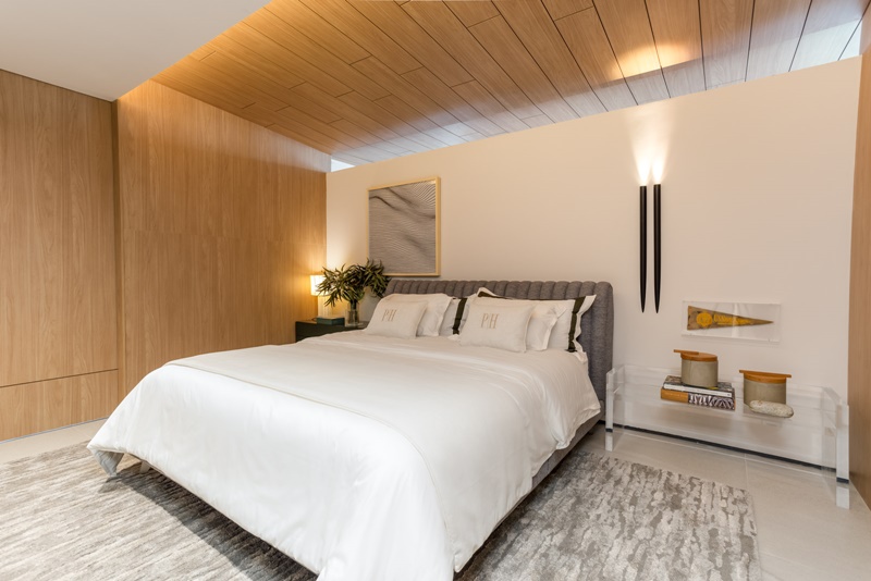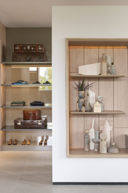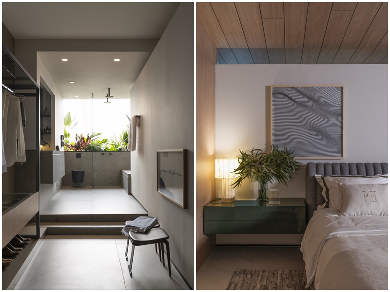 Um novo pórtico se abre e abraça a sala de banho. Não menos importante, o quarto é o espaço mais intimista. Grandes portas de correr permitem a integração. A cama possui linhas verticais trabalhadas individualmente, e ao mesmo tempo sugerem uma curva, unindo tecnologia construtiva e design artesanal. No lounge de saída, estantes assinadas pela arquiteta e fornecidas pela Dunelli recebem uma coleção de ampulhetas, fazendo alusão que apenas o tempo pode curar tudo.