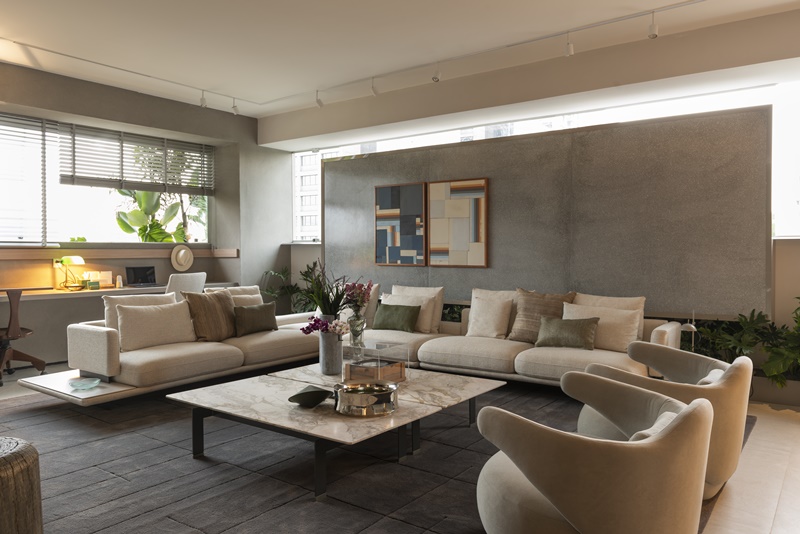 A necessidade de ambientes arejados em uma situação de pandemia é uma das principais características trazidas pelos profissionais da Casacor. Mas além da ventilação cruzada, um pré-requisito da própria mostra, o projeto Loft Zéfiro Dunelli traz um elemento inovador: vãos de entrada de ar, que integram todos os ambientes no alto das paredes.