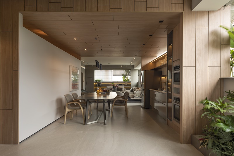 No amplo ambiente, patrocinado pela Dunelli, logo na entrada, uma porta generosa e pivotante se destaca. Ao adentrar, revela um espaço onde a premissa é leveza. Ao passar pelo Hall de distribuição, a janela se abre, e um volume se forma, demarcando a área da Cozinha e Sala de Almoço. Com o pé direito mais alto e volumes pronunciados, o Living é emoldurado pela vista. É no espaço mais generoso da casa, que a paisagem de tirar o fôlego se anuncia: o Home Office passa a coexistir e permite um momento de absoluto respiro. Em total interação, o closet completamente aberto, confere fluidez.