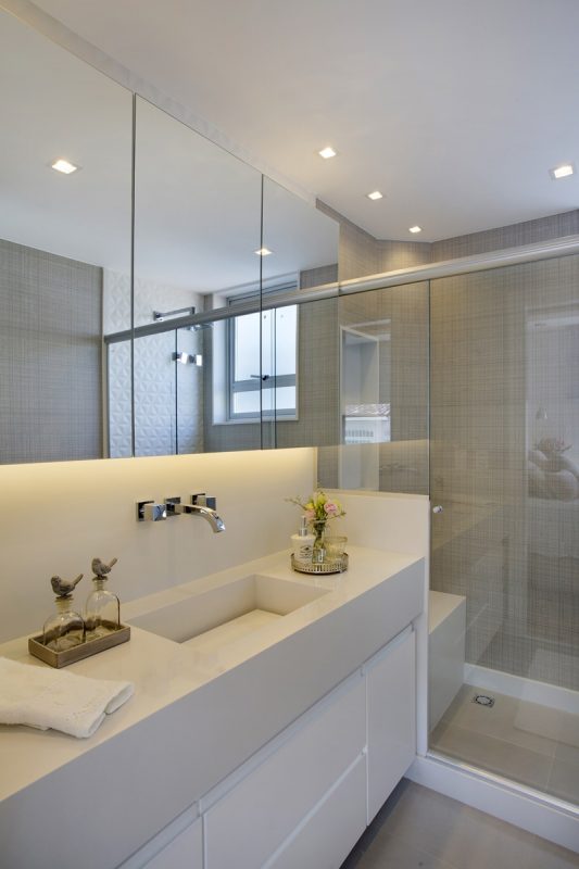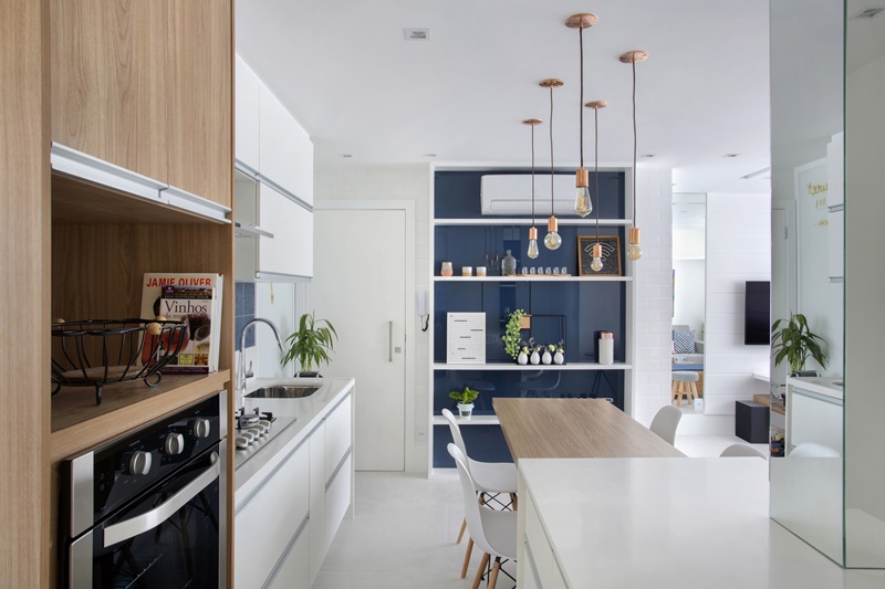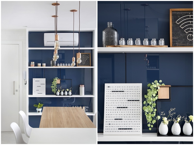 Com a cozinha sendo integrada à sala, a estante em laca branca com fundo em vidro pintado esconde o quadro de luz entre prateleiras, sem prejudicar o livre acesso. Ainda na cozinha, um grande vidro pintado de branco reveste parte de uma parede perto da área do bar/café para escrever recados e avisos.