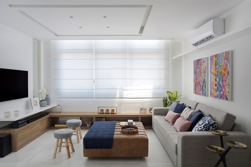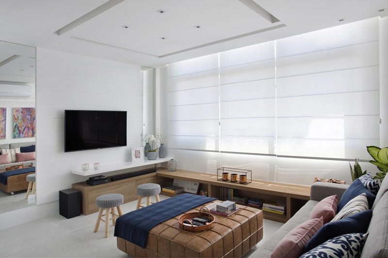 Na sala, além do sofá, um grande banco em marcenaria para assento e decoração complementa o espaço.