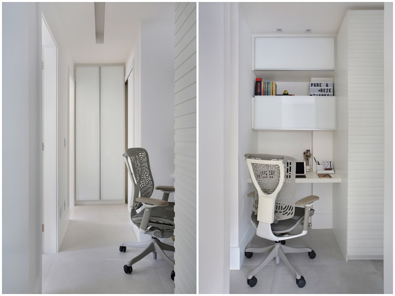 O ar antigo do apartamento foi renovado e criando-se um ambiente jovem e feminino para o início da vida adulta da jovem profissional. O Home Office no corredor, rouba um pedaço do que era o quarto de serviço.