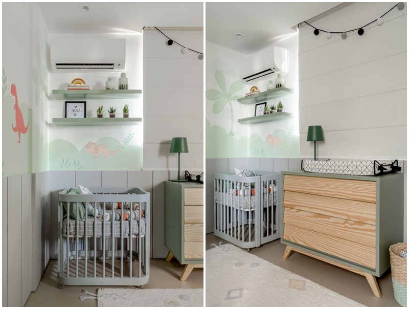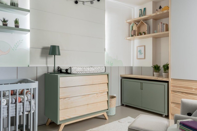 A marcenaria, que não havia sido executada até então, foi pensada de forma a acompanhar o crescimento do bebê Martin, sem ser datada nem parecer com os tradicionais quartos de bebê. Cores neutras, como o cinza claro e o verde pastel, associadas à madeira pinus, foram as escolhas da arquiteta para servir de base para a decoração. “Deixei para inserir cores mais fortes nos detalhes e na pintura artística com tema de dinossauro”, conta Marina. “Um painel em marcenaria forrado em fórmica cinza camufla a entrada para a porta do banheiro da suíte. Gosto de lançar mão deste recurso nos meus projetos porque cria uma unidade visual na decoração”, acrescenta ela.