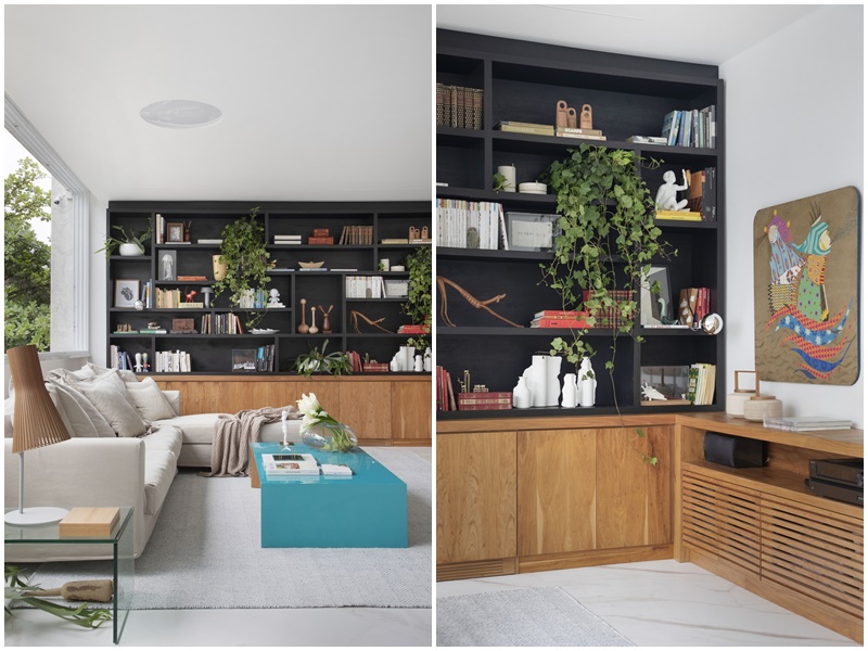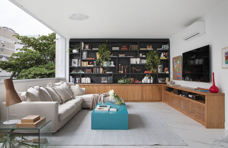 Na decoração, o arquiteto destaca a estante que vai do piso ao teto na parede lateral da sala, executada em freijó natural na parte inferior e em madeira ebanizada em cima, onde ficam os nichos. Perpendicular a ela, o rack sob a tv também foi executado em freijó, conferindo unidade visual ao conjunto e ajudando a delimitar o ambiente de estar com tv. No mesmo espaço, também chama a atenção a mesa de centro Matriz, assinada pelo designer Jader Almeida, com acabamento em laca turquesa, trazida do endereço anterior. Por estar muito danificado, o piso original da sala, que era em taco, foi substituído por um porcelanato fosco que imita mármore calacata, em placas de 120x120cm. Já na área íntima, como o taco estava em bom estado, o piso foi restaurado, deixando os quartos mais acolhedores.